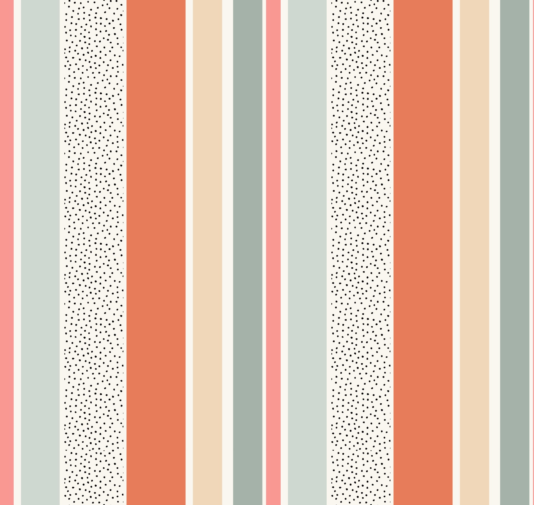 This wallpaper design features a cheerful and vibrant pattern of vertical stripes in coral, peach, light gray, and soft pink. The stripes are interspersed with columns of tiny black dots on a cream background, adding a playful texture to the overall design. The color palette evokes a feeling of warmth, relaxation, and summer sunshine. The clean lines and simple design make it incredibly versatile, perfect for adding a touch of modern sophistication to any room, from a bedroom to a living room. The subtle use of black dots provides a nice contrast without being overpowering, making it an excellent choice for those who prefer a more understated aesthetic. Its bright yet calm energy creates a welcoming atmosphere.
