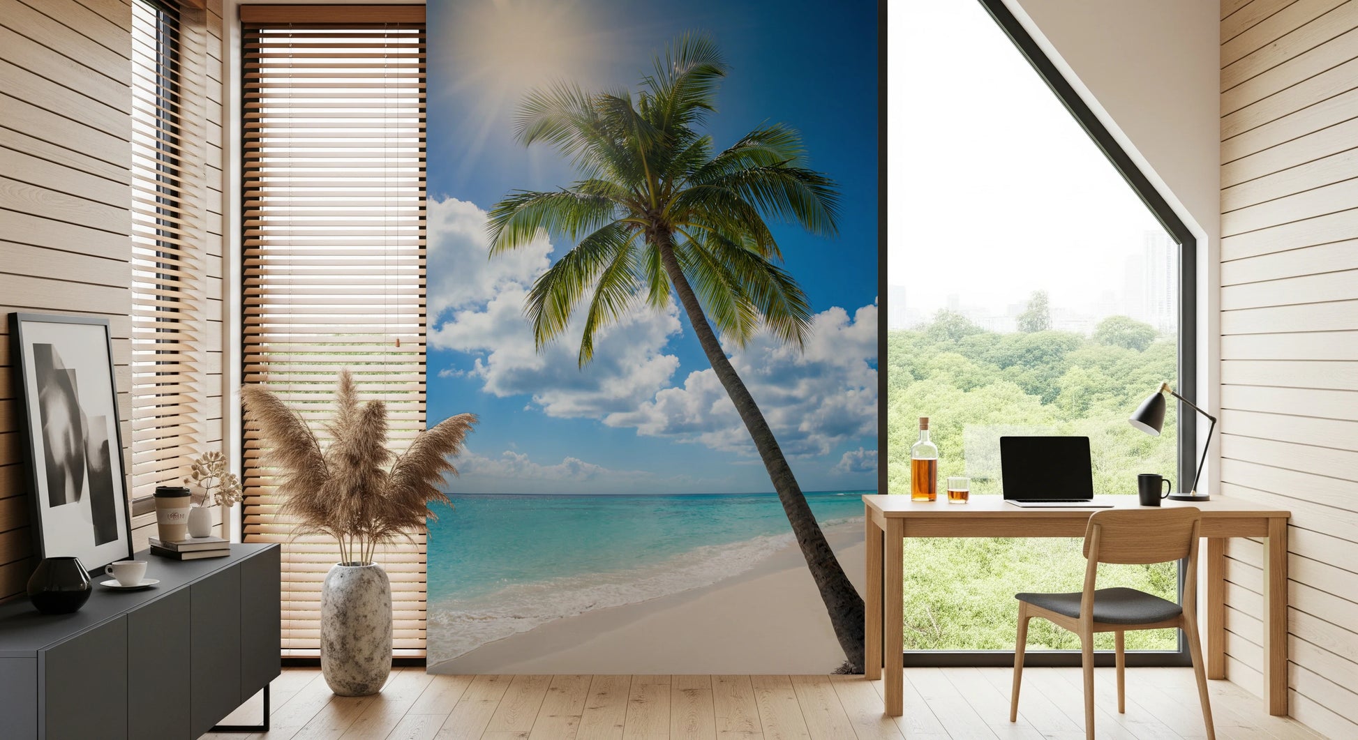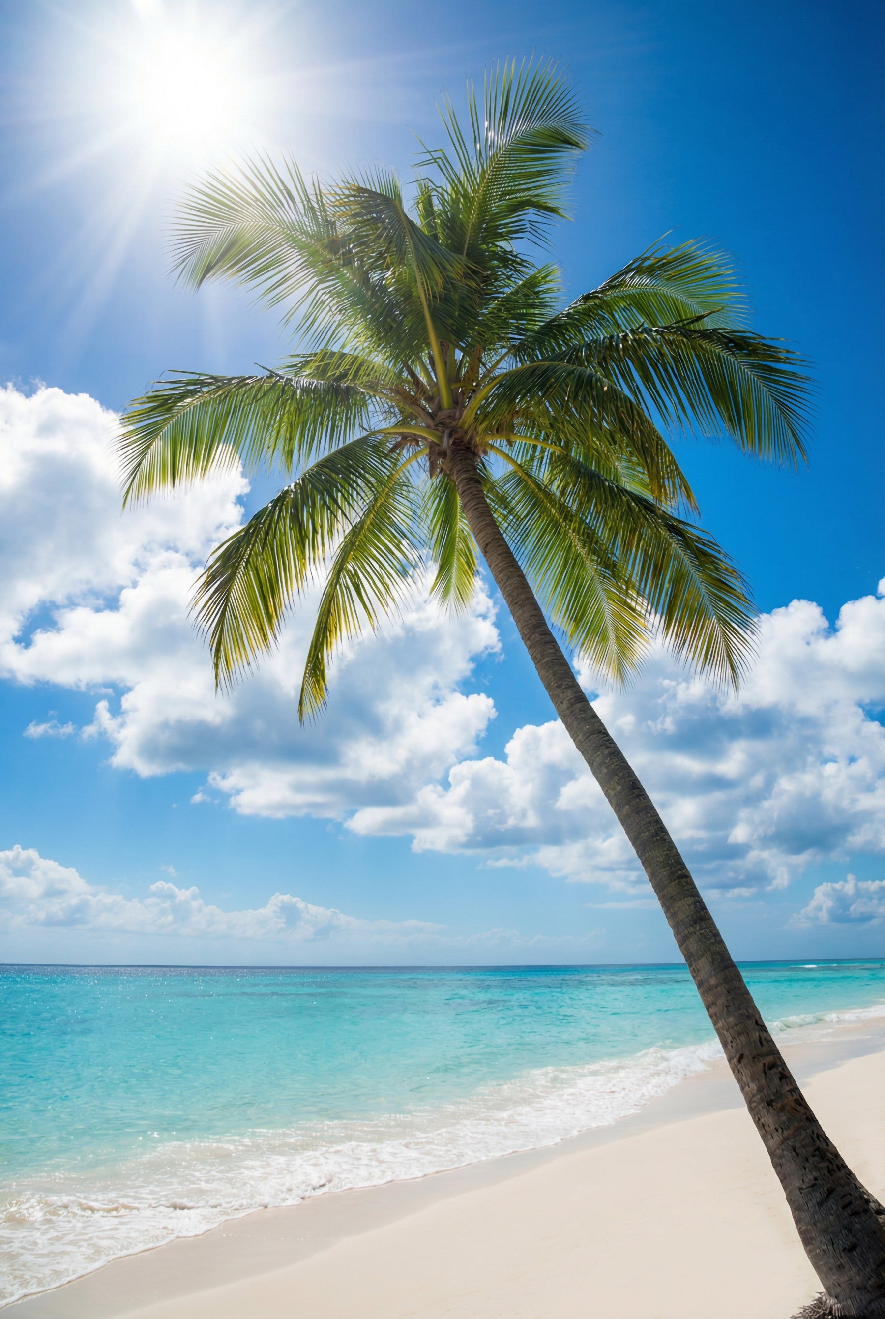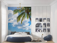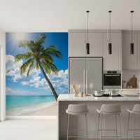 Bring the allure of a sun-drenched beach into your home with this stunning wallpaper for walls. This captivating design features a tall palm tree bending towards the turquoise sea, set against a backdrop of bright blue skies and fluffy white clouds. The sun's radiant glow infuses the scene with warmth and light. This wallpaper enhances interior spaces by adding depth and a refreshing, airy feel. It's ideally suited for brightening up living rooms, bedrooms, hallways, or any space where you want to create a relaxing, tropical-inspired ambiance.