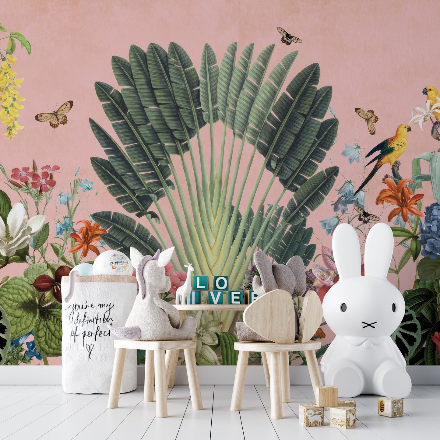 The sunbeam canopy wall mural offers a spectacular visual feast of flora and fauna, transforming any room into a vivid tableau of nature's beauty. This botanical wallpaper captures a serene yet vibrant garden scene, complete with an assortment of tropical leaves, fluttering butterflies, and exotic birds. Its design is carefully crafted to ensure each detail contributes to a realistic and engaging experience, making it perfect for those seeking to bring the tranquility of nature indoors. Beyond its aesthetic appeal, the mural acts as a focal point, creating a peaceful yet dynamic atmosphere that enhances any living space, be it a bedroom, living room, or study area.