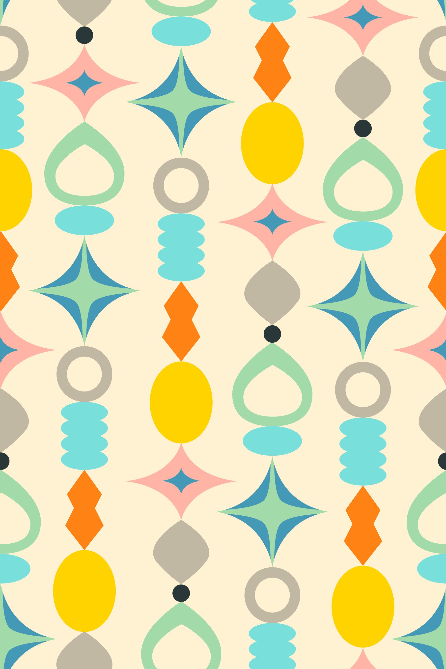 Cream-colored wallpaper with colorful geometric shapes in retro design.