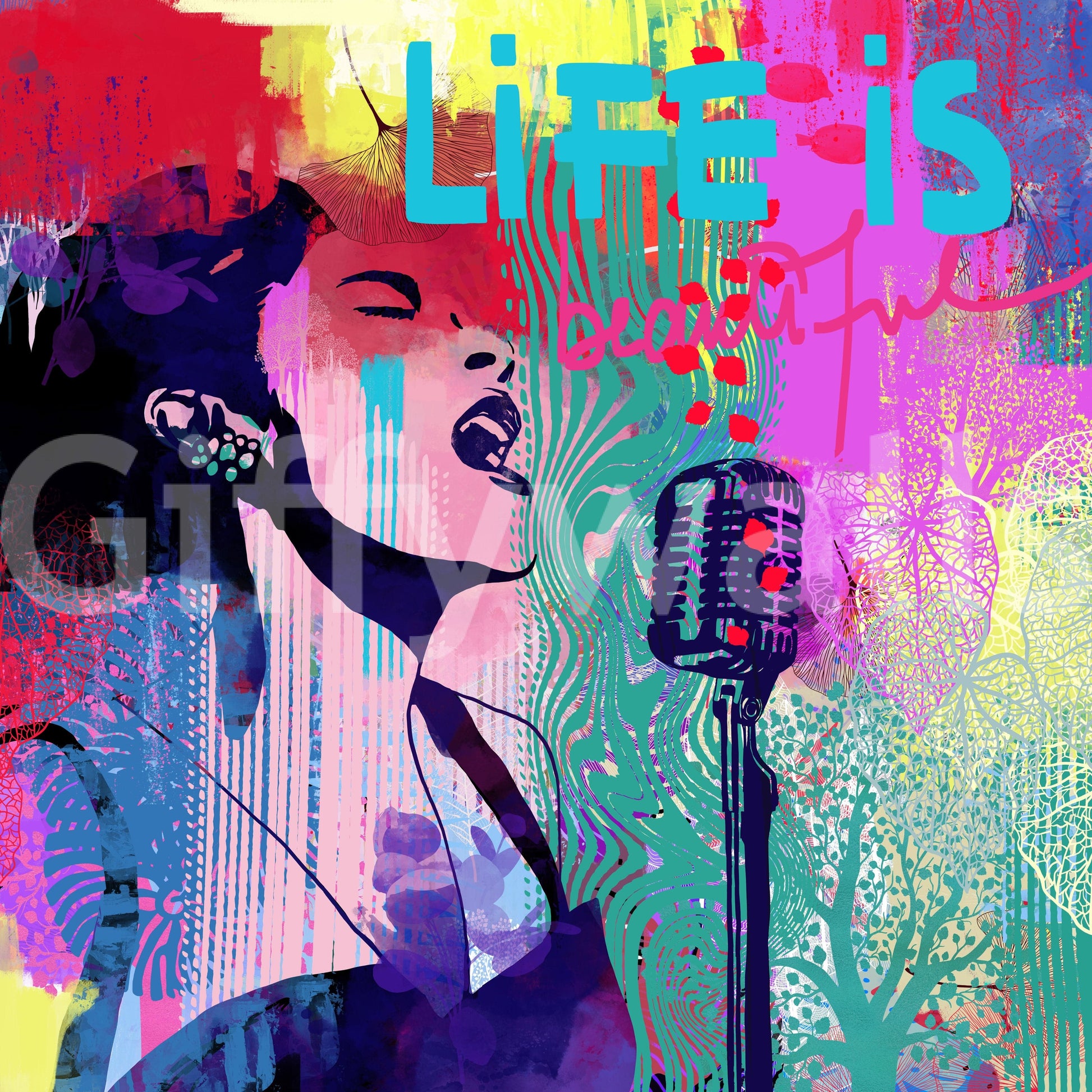 Embrace the melancholic charm of 'Sunday Blues', a striking piece of wall décor that captures the wistful beauty of a weekend winding down. A stylized silhouette of a singer, bathed in shades of deep indigo and vibrant blues, pours her heart out against a backdrop of abstract expressionism. The classic microphone hints at vintage melodies and forgotten tunes, while splashes of vivid pinks, yellows, and teals evoke a sense of lingering warmth battling the encroaching dusk. Botanical elements peek through the artistic chaos, suggesting a quiet beauty found even in moments of reflection. This piece brings a sophisticated, artistic edge to any space, ideal for those who appreciate raw emotion and the captivating allure of a soulful serenade. Let the emotive energy of 'Sunday Blues' transform your space into a haven of introspection and artistic inspiration.