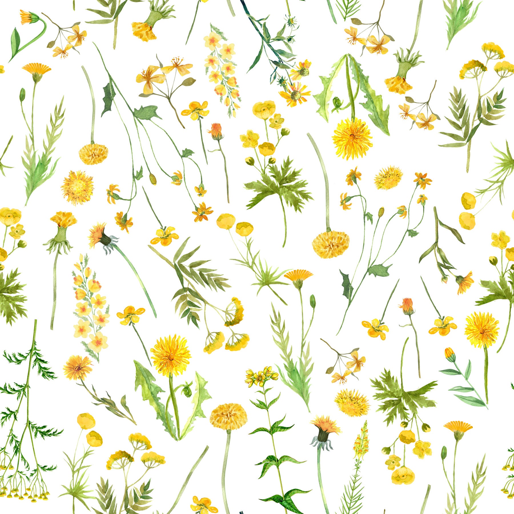 Bring the warmth of a summer meadow into your home with this delightful floral wallpaper by Uta Naumann. The design showcases a watercolour style, presenting various yellow wildflowers and green foliage in a seamless pattern. It's a cheerful and inviting choice for any room. This wallpaper for walls adds a refreshing touch to bedrooms, living rooms, or even kitchens, creating a relaxing and vibrant atmosphere. The bright colours and natural motif complement interiors, infusing spaces with a touch of the outdoors and spreading joy.