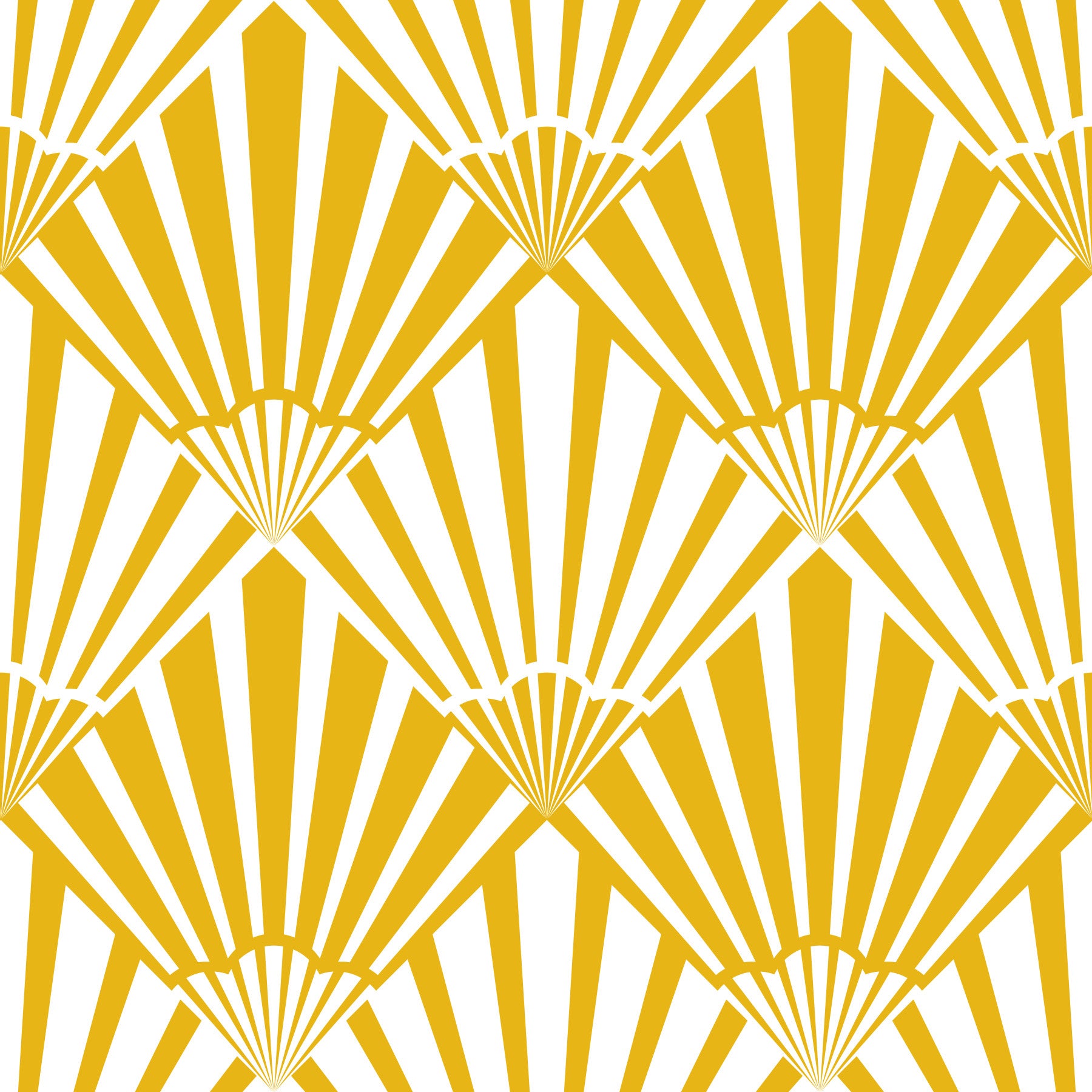 Evoke the glamour of a bygone era with this vintage-inspired Sunrise Art Deco wallpaper that seamlessly blends abstract geometric forms with an elegant color palette. This sophisticated pattern features diamond fan-like motifs, reminiscent of the Art Deco period, rendered in a harmonious combination of yellow gold and white. The sunrise theme is subtly suggested through the radiating lines and warm color accents, creating a sense of optimism and timeless style. Perfect for adding a touch of vintage charm and refined elegance to any space, this versatile design complements both modern and traditional décor, and can add a touch of glamorous Roaring Twenties and Jazz Age style to any space. This pattern design is also available in Other Colourways too! Original wallpaper pattern design by Jackie Tahara of UnBlink Studio.