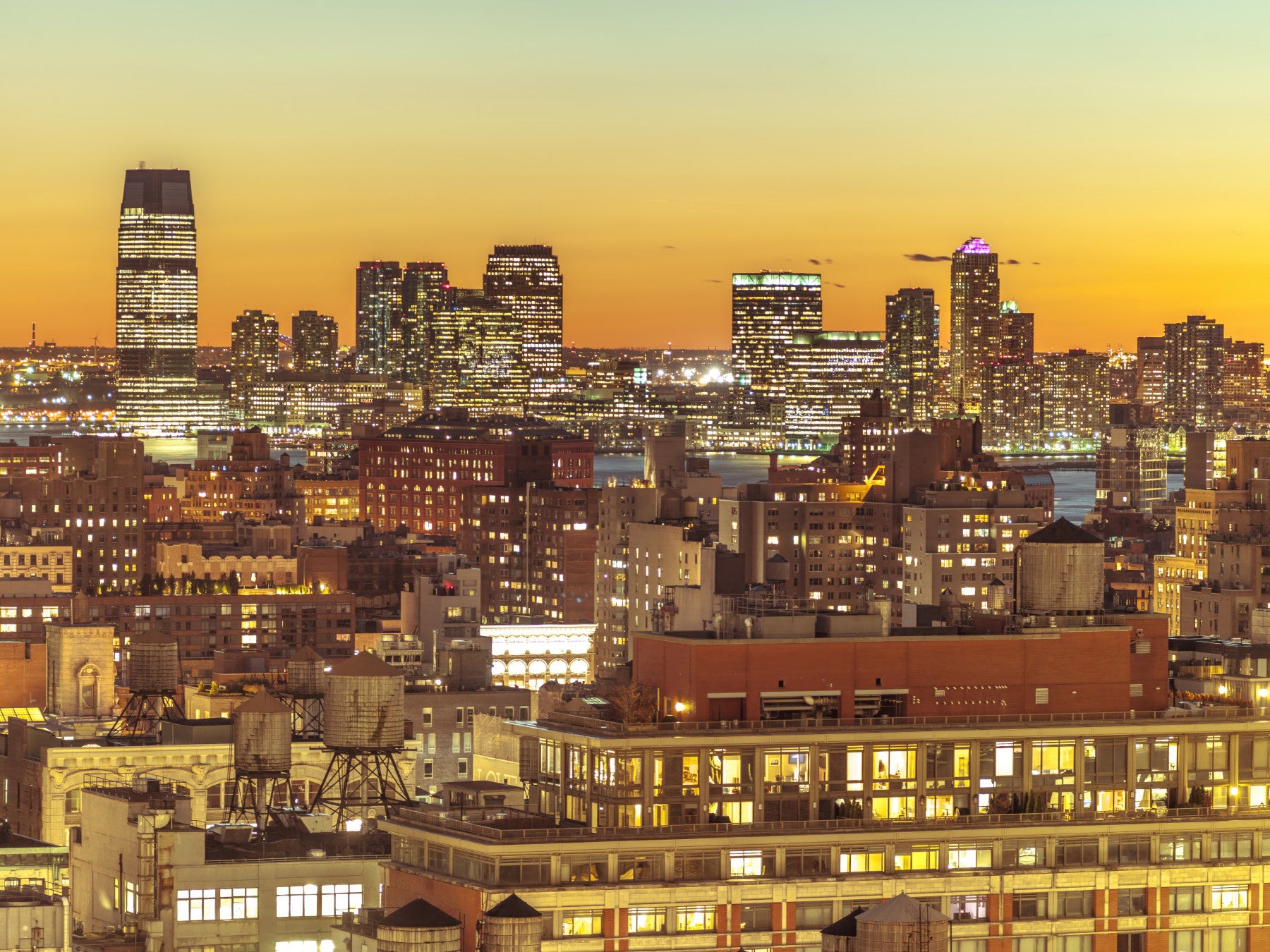 The Sunset Metropolis Wall Mural captures the warm, glowing energy of a city skyline at dusk. This design showcases a dense urban landscape with tall, illuminated buildings set against a vibrant orange and yellow sky. The foreground highlights characteristic metropolitan details, such as water towers on rooftops, adding a sense of realism and depth to the scene. This high-resolution imagery brings a lively yet sophisticated atmosphere to your living space or professional environment. The Sunset Metropolis Wall Mural uses a rich color palette that works well with both modern and industrial furniture styles. It is a durable and practical choice for creating a striking focal point on any flat surface.