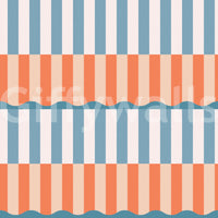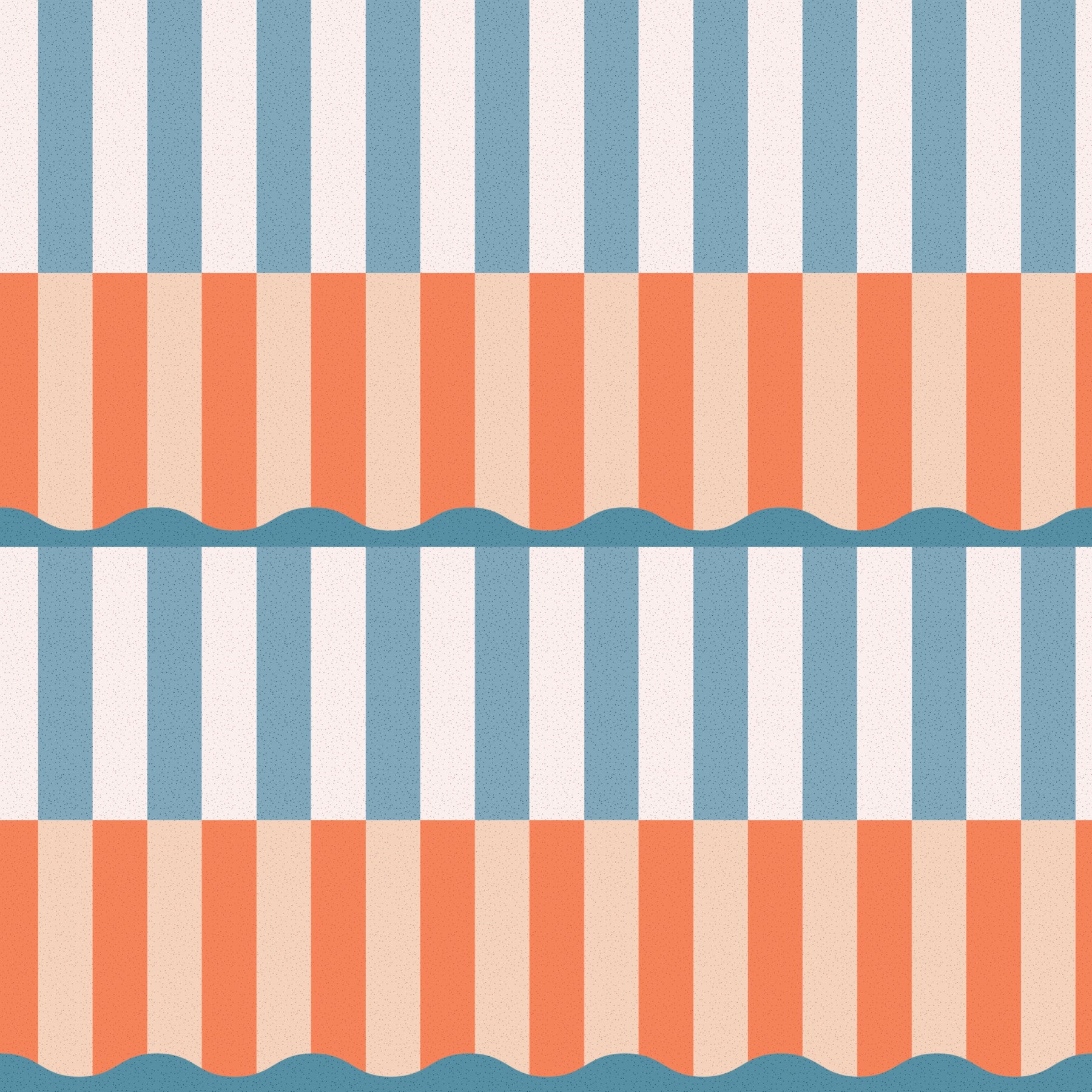 Sunset Waves captures the carefree rhythm of the seaside with bold, alternating stripes inspired by beach huts and coastal parasols. The soft coral-orange and ocean-blue palette evokes sunshine reflecting off gentle waves, while the playful wavy border adds a touch of movement and joy. Perfect for lovers of modern coastal vibes and bold minimalism geometry.