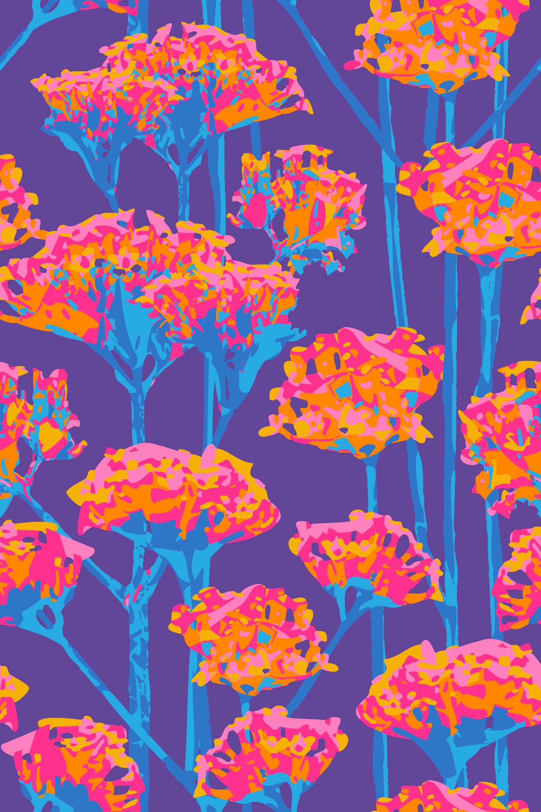 Immerse yourself in the vibrant color of Summer with this Sunshiney abstract floral wallpaper. Playful abstract flowers unfold against a bright purple backdrop, instantly infusing any space with a cheerful and uplifting energy. The bold pink, orange and sunny yellow floral clusters, supported by slender sky blue stems, create a captivating pattern reminiscent of a sun-drenched meadow bursting with life. This design perfectly captures the essence of a bright Summer day, offering a delightful escape into a world of colorful botanicals, a guaranteed mood booster and a stylish statement piece for any room. Bring the joy of warm sunny days indoors and let this colorful floral scene transform your walls into a lively botanical haven. This pattern design is also available in Other Colourways too! Original wallpaper pattern design by Jackie Tahara of UnBlink Studio.