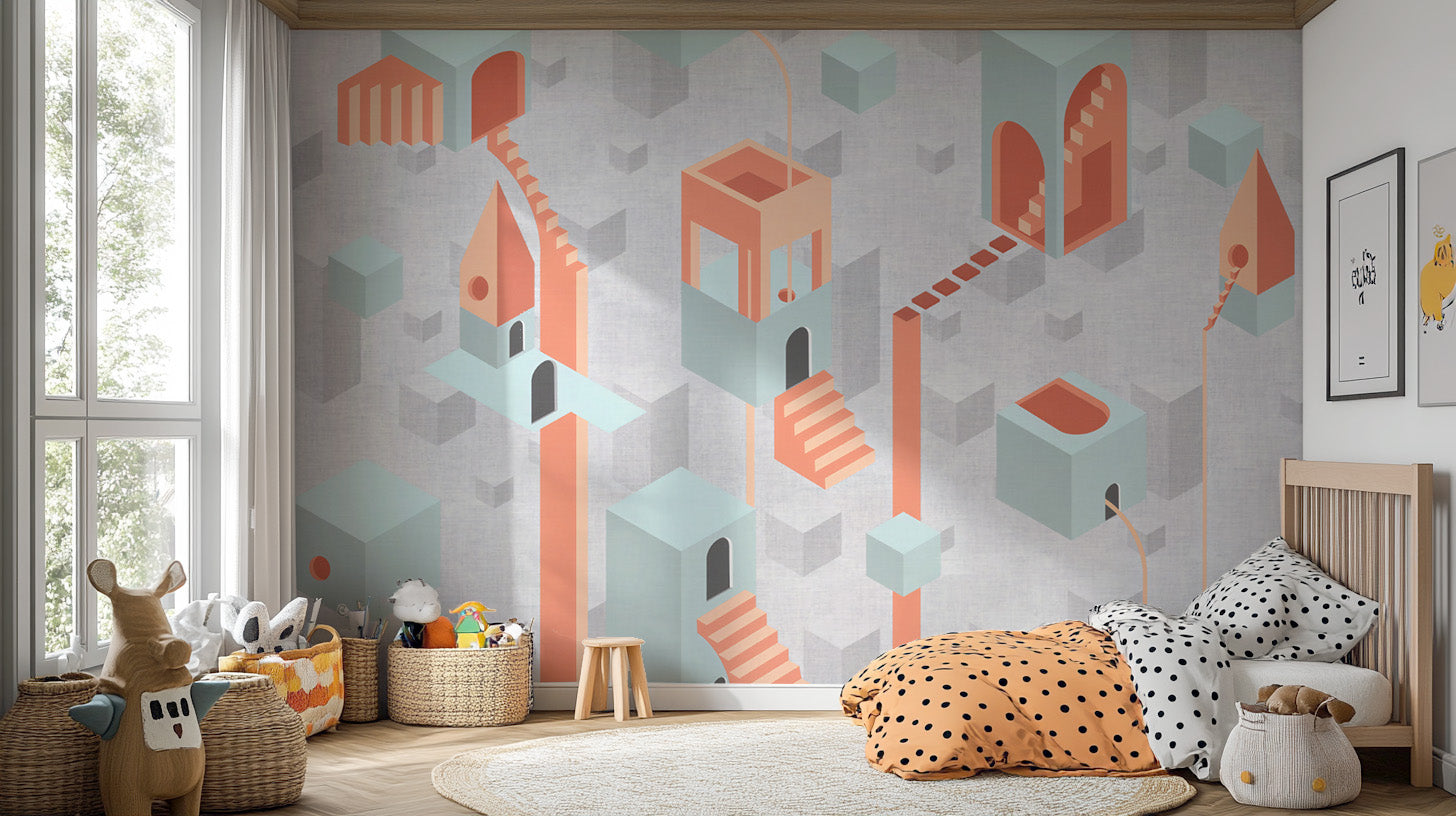Surreal geometric architecture wallpaper is one perfect choice for the bold yet minimalist designs on your walls. 3D isometric patterns include cubes, archways, and stairs, so it creates an eye-catching view while keeping the modern look at your walls. The pastel tones of peach, teal, and gray bring subtlety and refinement to bedrooms, living rooms, or office spaces. This wallpaper brings functionality and style together to add a modern edge to your interiors. Get yours now and enjoy Free Delivery.