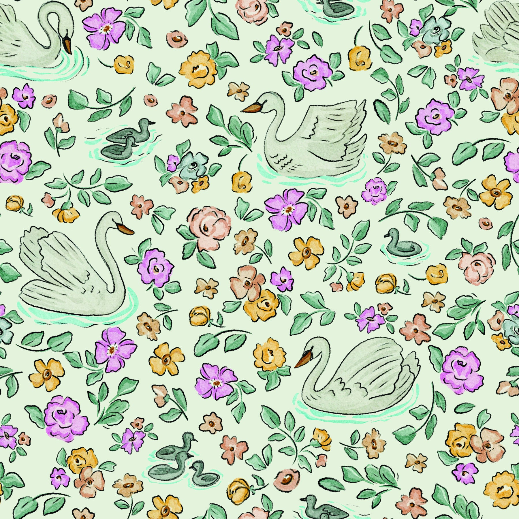 This wallpaper transports you to a picturesque swan lake, teeming with life and vibrant colors. The watercolor aesthetic beautifully captures the serene beauty of swans gracefully navigating the tranquil waters, amidst a delicate scattering of blooms in soft pastel hues. The charming design evokes a sense of peaceful elegance and is ideal for creating a soothing and sophisticated atmosphere in any room of your home. Its seamless pattern ensures a harmonious flow, adding a touch of dreamy romance to your walls.