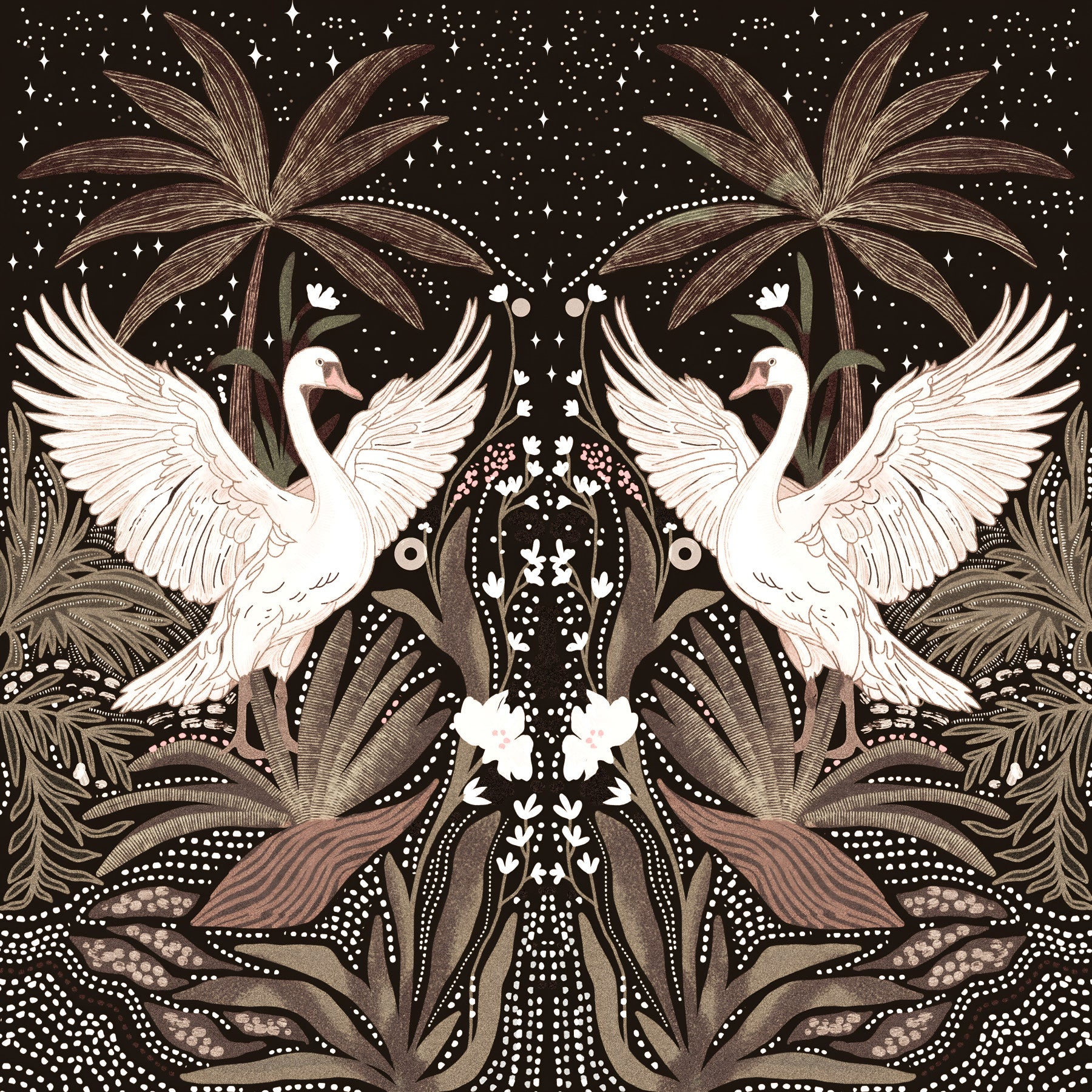 Symmetrical design magical Swan Nightfall Serenity mural print.
