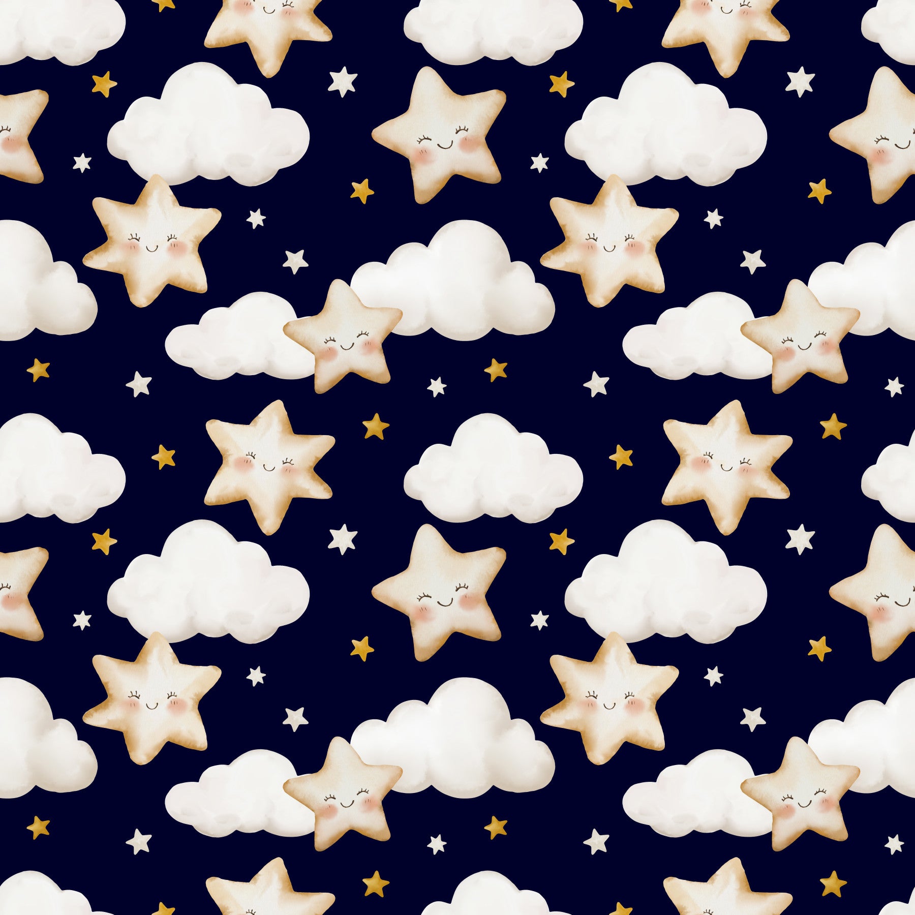 A calming navy wallpaper decorated with fluffy clouds and cheerful golden-edged stars.