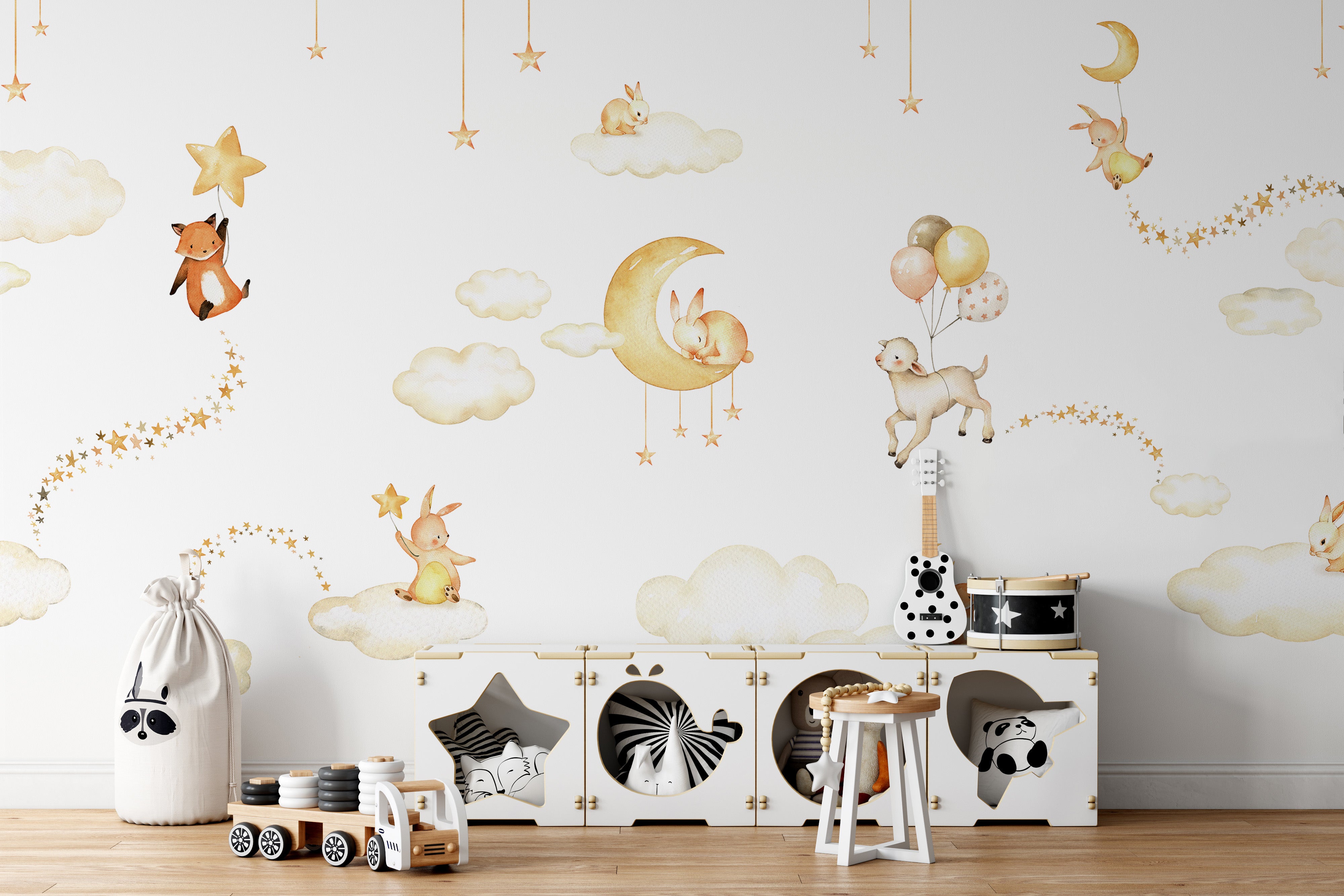 Transform your child’s space into a whimsical haven with dreamscape delight decors wall murals. Perfect for kids' rooms, this enchanting wallpaper features playful foxes, bunnies, and sheep amidst dreamy clouds, stars, and moons. Crafted with soft pastel tones and intricate details, it inspires imagination while offering a calming atmosphere for sleep and play. Made with durable, eco-friendly materials, this peel-and-stick wallpaper is easy to apply and remove, making decorating stress-free. Ideal for nurseries or playrooms, it’s the ultimate choice for parents seeking stylish yet functional kids room wallpaper. Redefine your child’s room with this magical design!