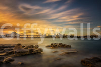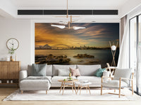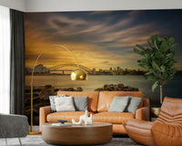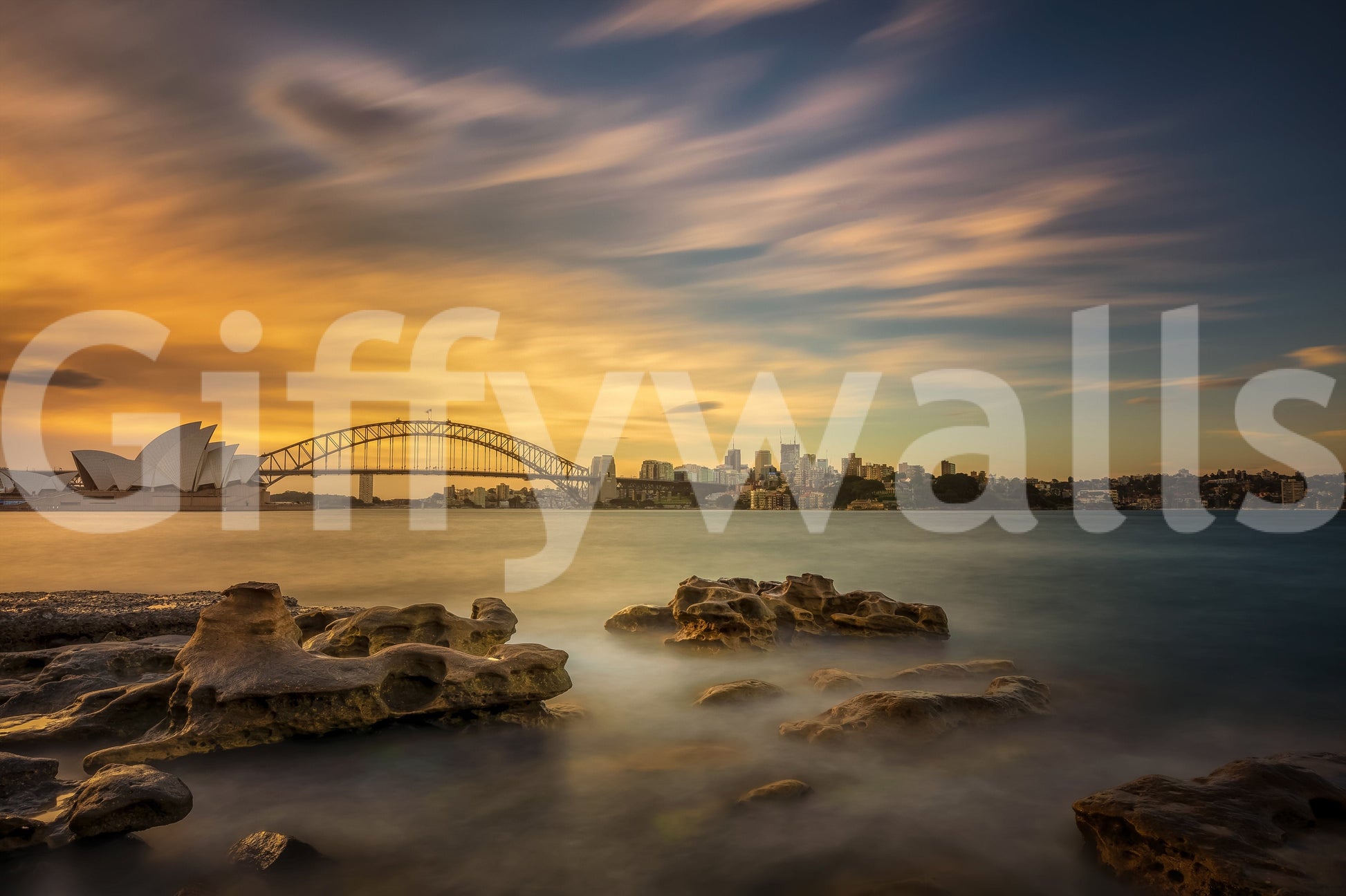 Immerse yourself in the captivating beauty of Sydney at dusk with "Sydney Sunset." This stunning wallpaper captures the iconic silhouette of the Sydney Opera House and Harbour Bridge bathed in the warm, golden hues of the setting sun. Wisps of clouds streak across the sky, painted in shades of orange, yellow, and soft blue, creating a dreamy and ethereal atmosphere. The foreground features rugged, textured rocks gently embraced by the silky smooth water, providing a grounding contrast to the vibrant sky. Feel the tranquillity and grandeur of Sydney as the day gracefully transitions into night. This image is perfect for adding a touch of sophistication and serenity to your digital space, transporting you to the heart of one of the world's most beautiful cities every time you glance at your screen.