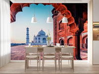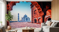 Transform your space with this breathtaking wallpaper for walls featuring the iconic Taj Mahal. The design frames the mausoleum through a striking red sandstone arch, creating depth and visual interest. The warm, earthy tones of the arch contrast with the cool blues and whites of the sky and building, offering a serene yet dramatic focal point. Ideal for adding a touch of elegance and history to living rooms, bedrooms, or hallways, this mural creates a sense of wonder and sophistication. This wallpaper enhances interior spaces by evoking a sense of global culture and architectural grandeur.