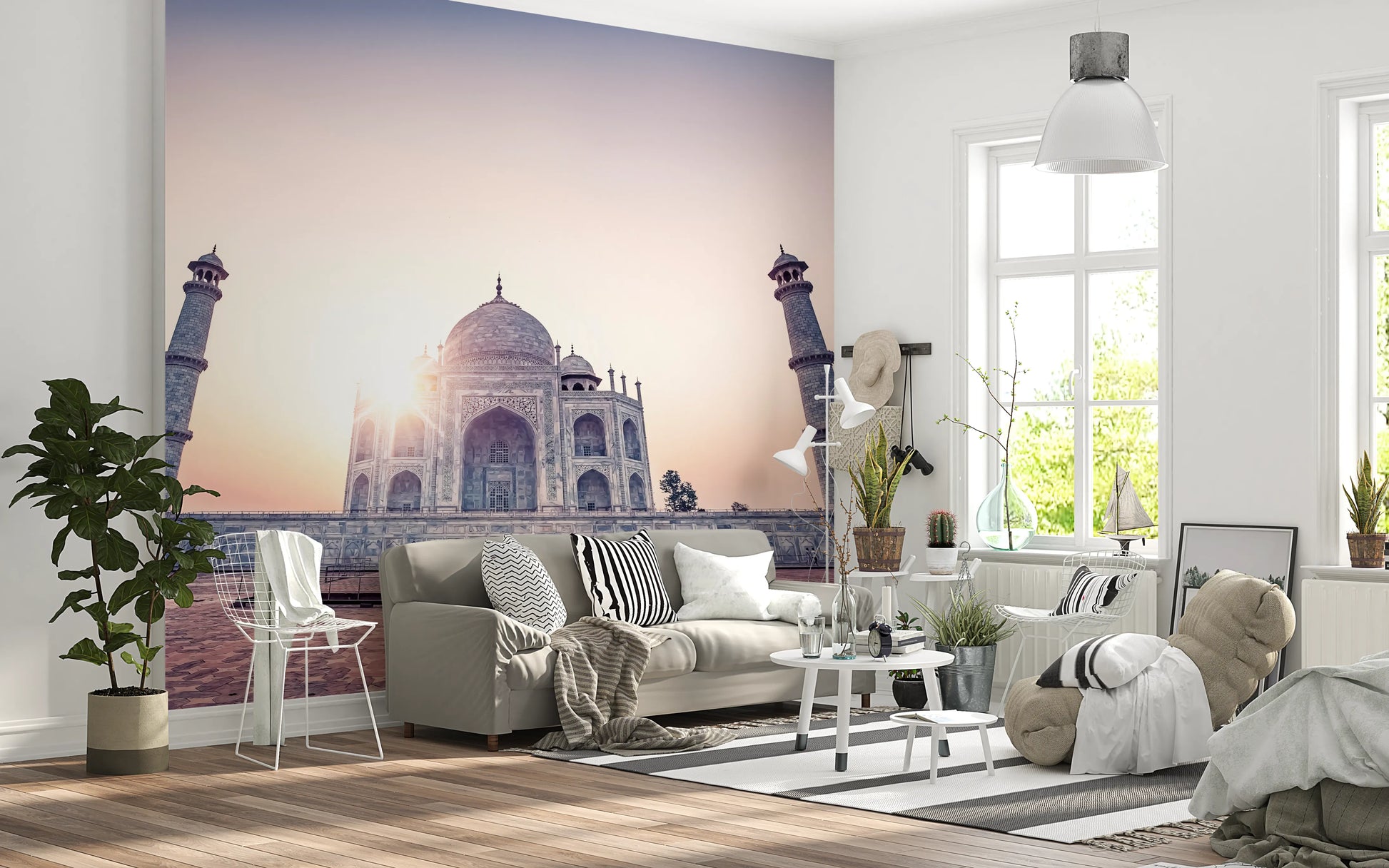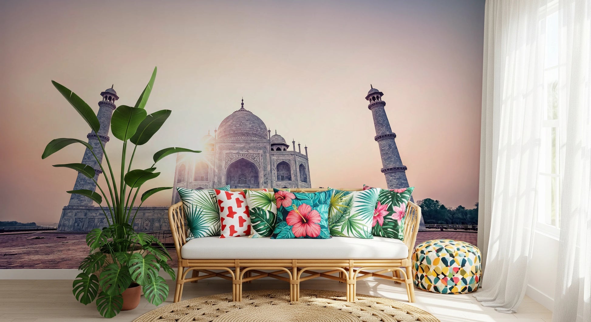 Elevate your living space with this enchanting Taj Mahal wallpaper for walls. The image captures the iconic monument bathed in soft, ethereal light. The subtle blend of pastel pinks and blues evokes a sense of serenity and timeless beauty. The architectural precision of the Taj Mahal, with its intricate details and towering minarets, will bring an air of sophistication to any room. This wallpaper lends itself well to bedrooms, living rooms, or even hallways, creating a peaceful and visually striking atmosphere. The design adds depth and character, transforming a simple wall into a stunning focal point.