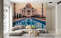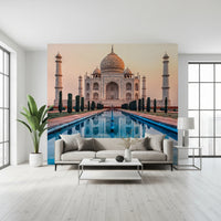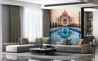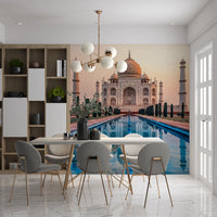 Transform your space with this breathtaking view of the Taj Mahal reflected in tranquil waters. The symmetrical design and soft colour palette of blues, peaches, and creams introduce a serene atmosphere to any room. The grandeur of the architecture creates a focal point, lending an air of sophistication and wonder to your home. Install this majestic design in your living room, dining area, or even an entryway to make a remarkable statement. This wallpaper for walls enhances your interior with a touch of historical charm and elegant beauty, seamlessly blending with both modern and classic décor styles.