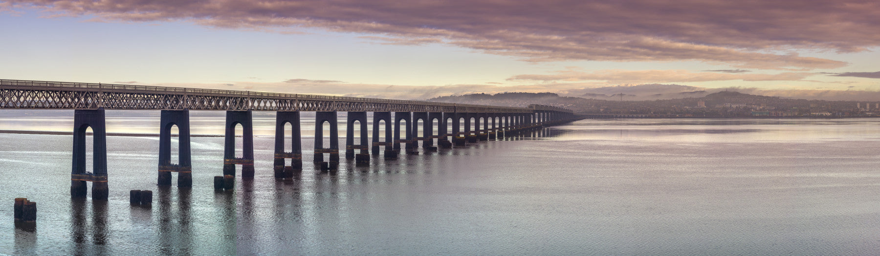 Tay Rail Bridge, Dundee, Scotland. Capture the peaceful atmosphere of a sunrise over the Tay Rail Bridge with this refined wallpaper. This design features a sturdy railway bridge cutting through tranquil waters, a serene image for any space. Soft pink and blue hues create a relaxing mood that complements a variety of interior styles. Use this wallpaper for walls to add a sense of calm and sophistication to living rooms, bedrooms, or office spaces. The linear composition and muted tones provide a classic and timeless appeal.