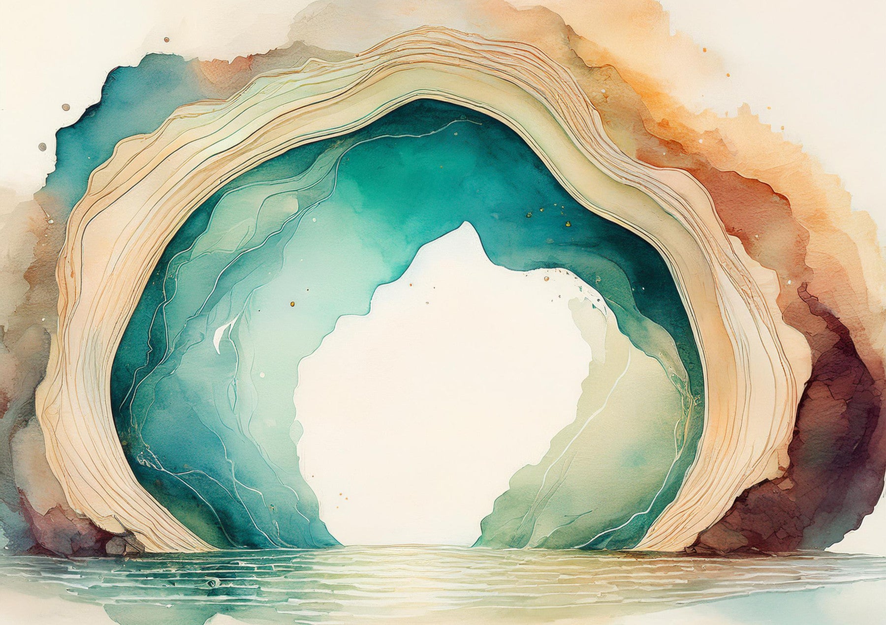 This abstract watercolor wallpaper captures the tranquil essence of a hidden coastal cave. Soft teal and warm beige tones blend seamlessly, creating a calming atmosphere. Delicate lines suggest layers of rock formations, while the open space within the cave evokes a sense of mystery and serenity. The subtle water at the base adds a touch of realism to this otherwise dreamlike depiction. The overall mood is peaceful and meditative, making it perfect for creating a tranquil ambiance in any room.