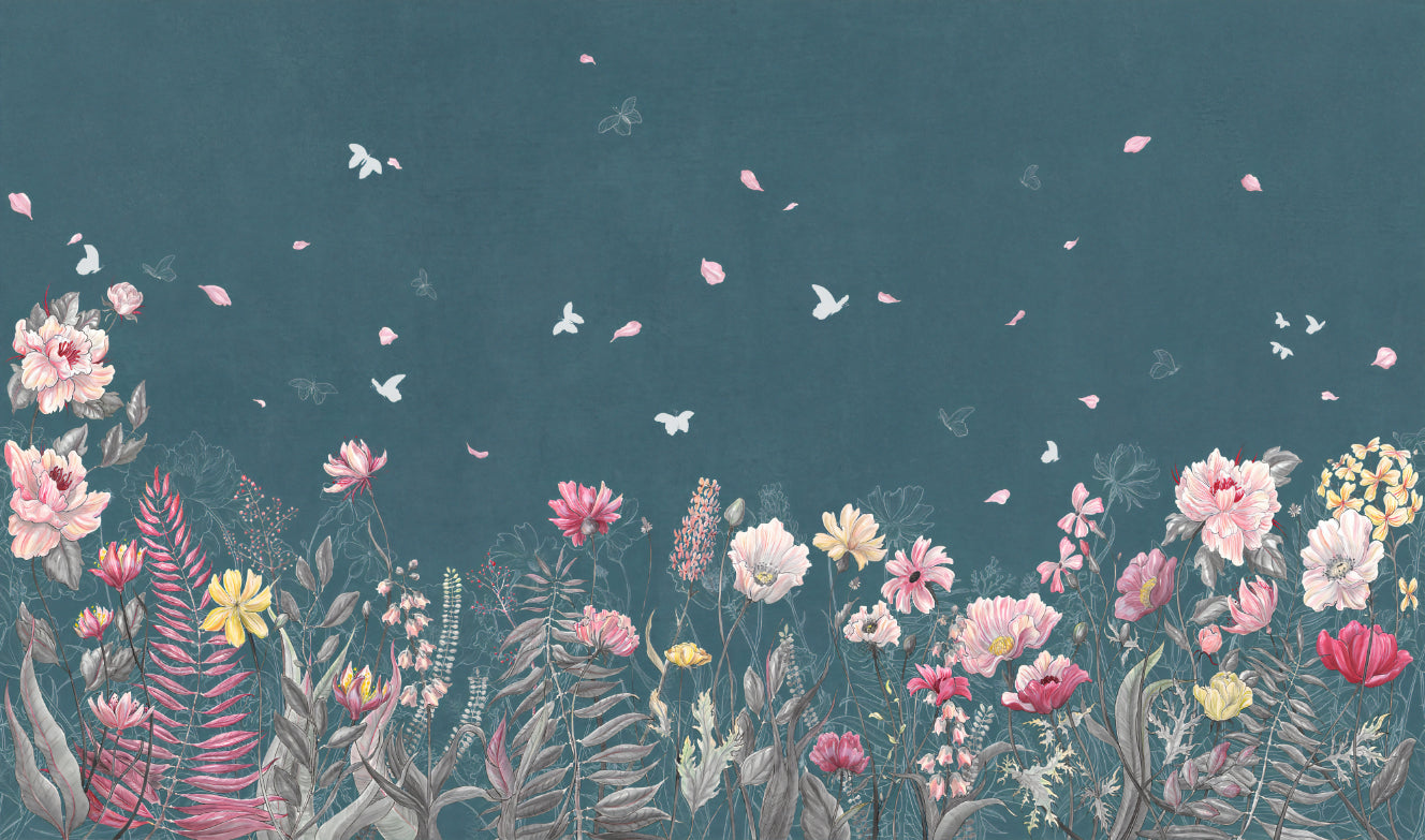 The teal floral botanical wallpaper features a rich teal background adorned with pastel flowers, fluttering butterflies, and falling petals. This floral wallpaper with a teal background brings a whimsical yet elegant touch to any room. The soft pinks, yellows, and greens blend seamlessly, making it ideal for living rooms, bedrooms, or creative spaces. The botanical wallpaper with butterflies adds depth and movement, creating a lively focal point. Perfect for modern and classic interiors, this pastel flower mural wallpaper complements various styles while adding a natural, refreshing feel. It is a stunning choice for those seeking a vibrant botanical mural for their walls.