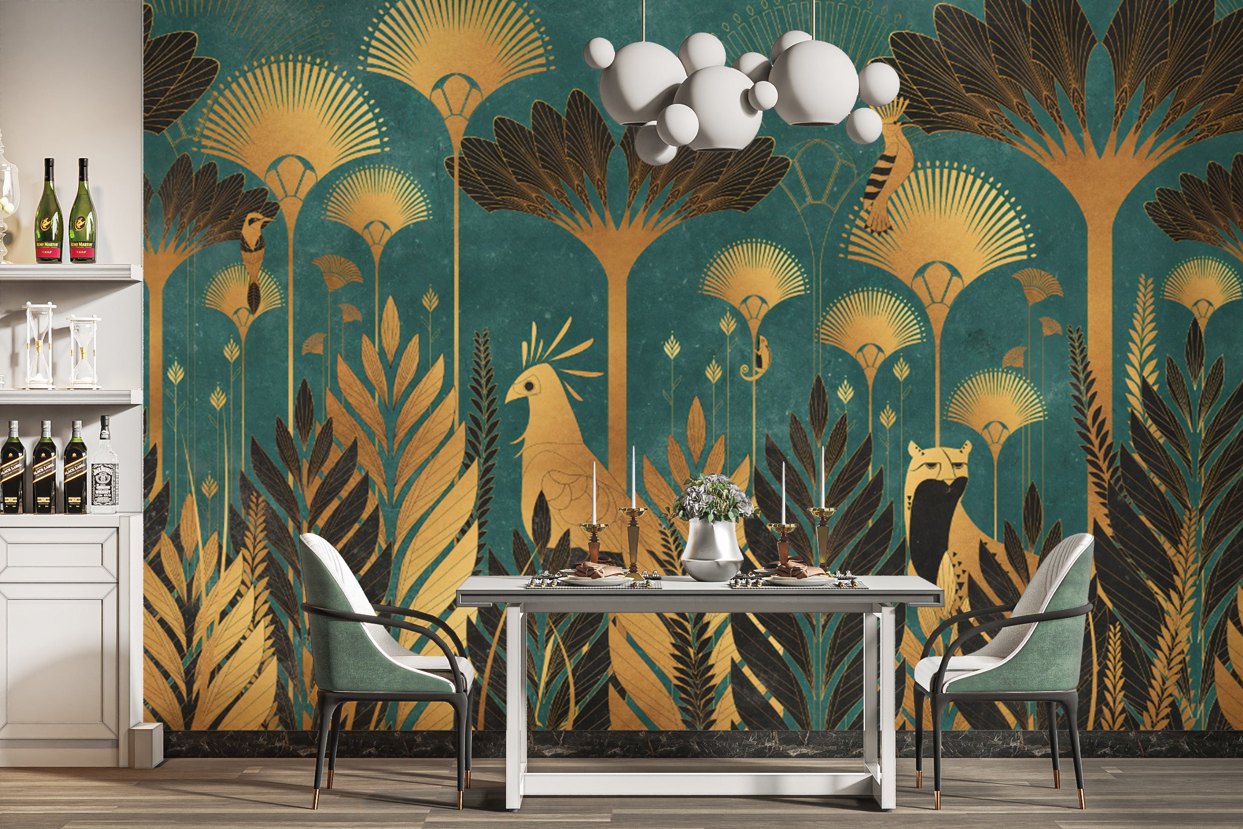 Teal luxurious Art Deco jungle wallpaper with golden parrots