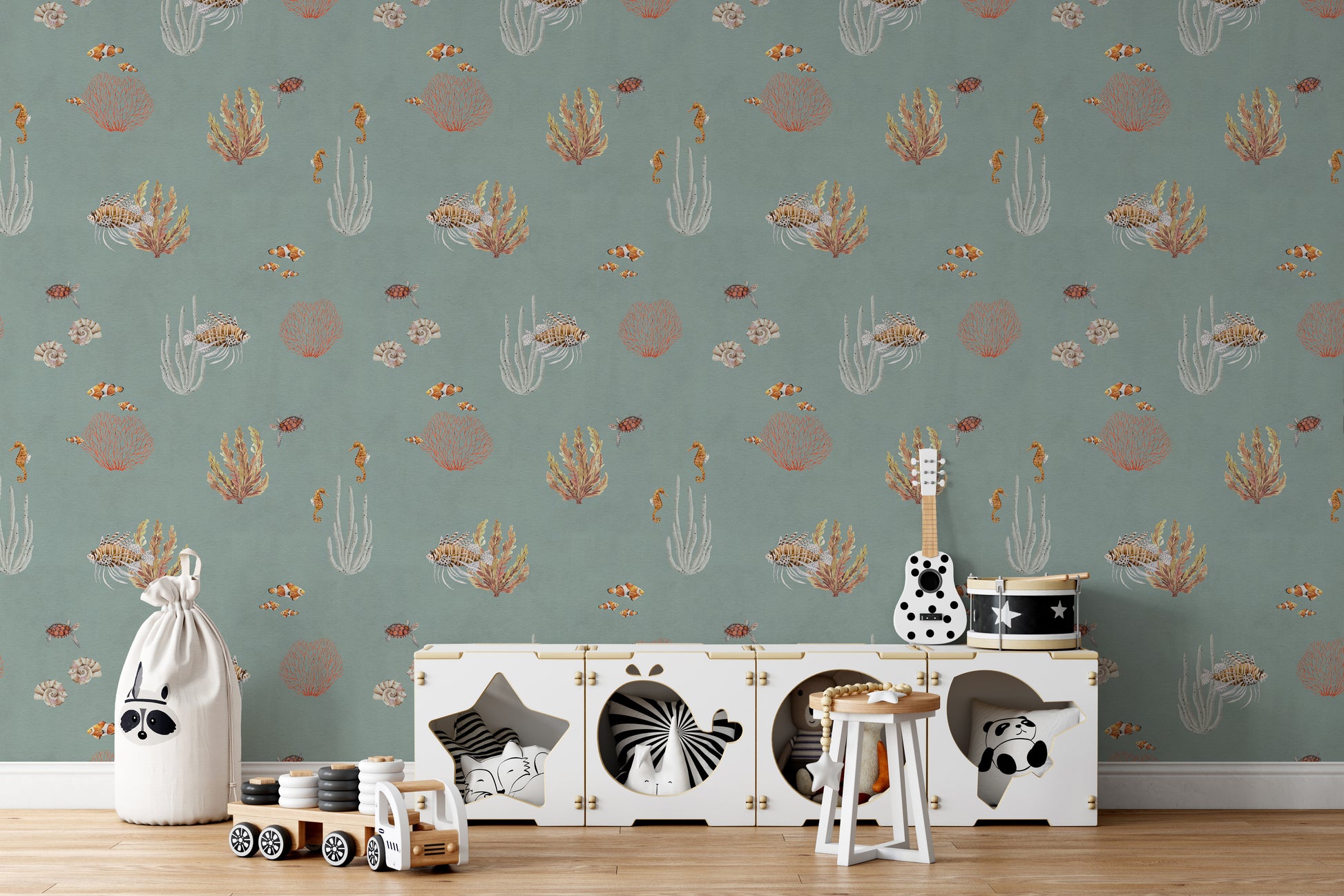 Immerse your space in the tranquil beauty of the Teal Oceanic Wonders Wallpaper Mural. Featuring a mesmerizing underwater scene with delicate coral reefs, graceful sea creatures, and soft aquatic hues, this design brings coastal charm to any room. The soothing teal background enhances the intricate details of clownfish, seahorses, and lionfish, creating a serene marine escape. Perfect for beach-inspired interiors, kids' rooms, or nature lovers, this wallpaper transforms walls into an elegant ocean paradise. Crafted with high-quality materials, it’s easy to install and remove, offering a seamless way to refresh your decor with the timeless beauty of the sea.