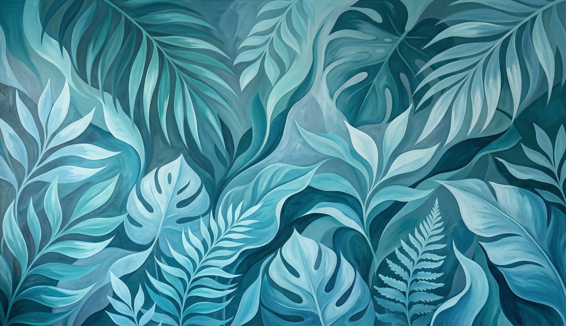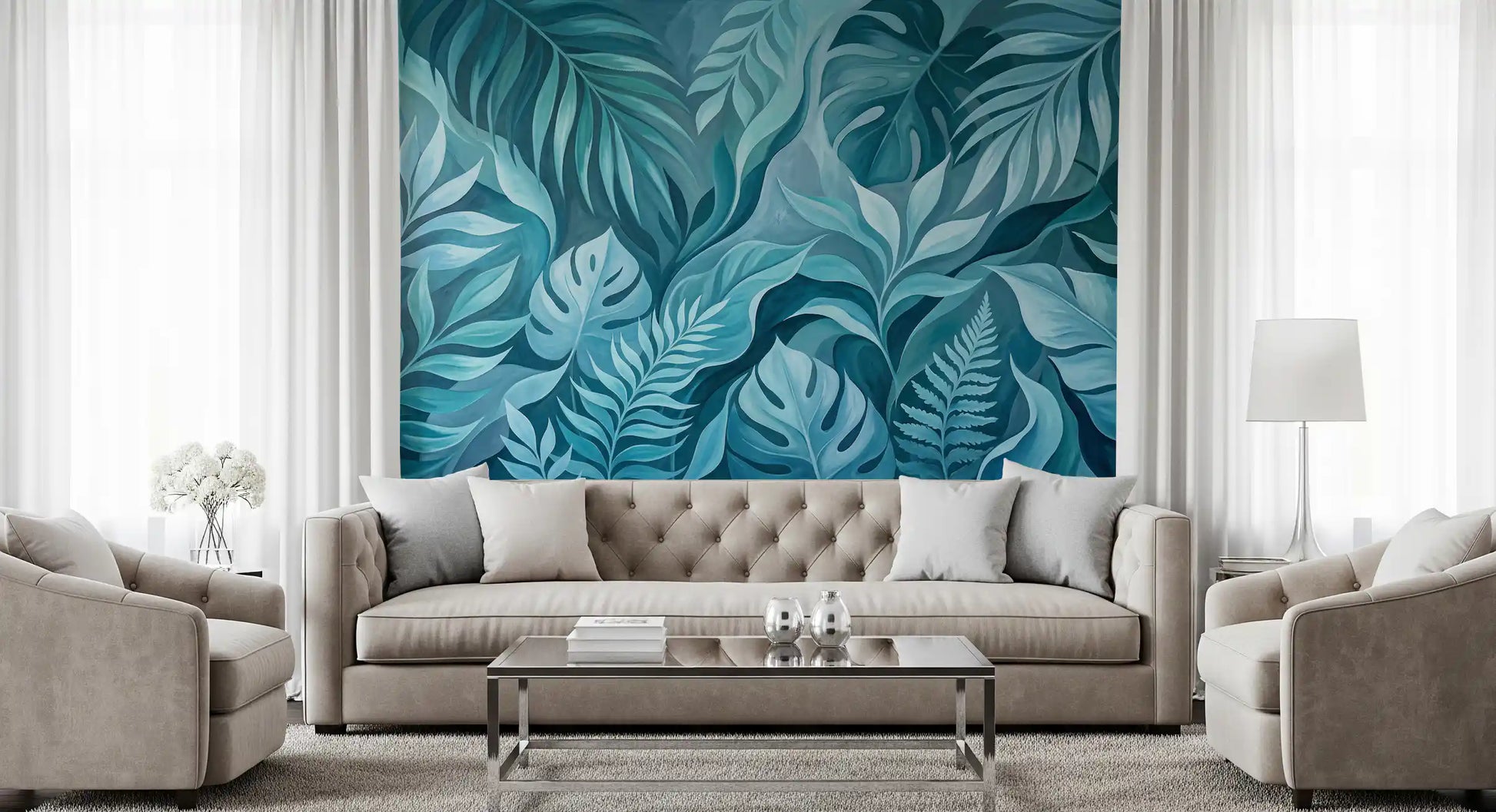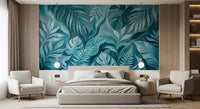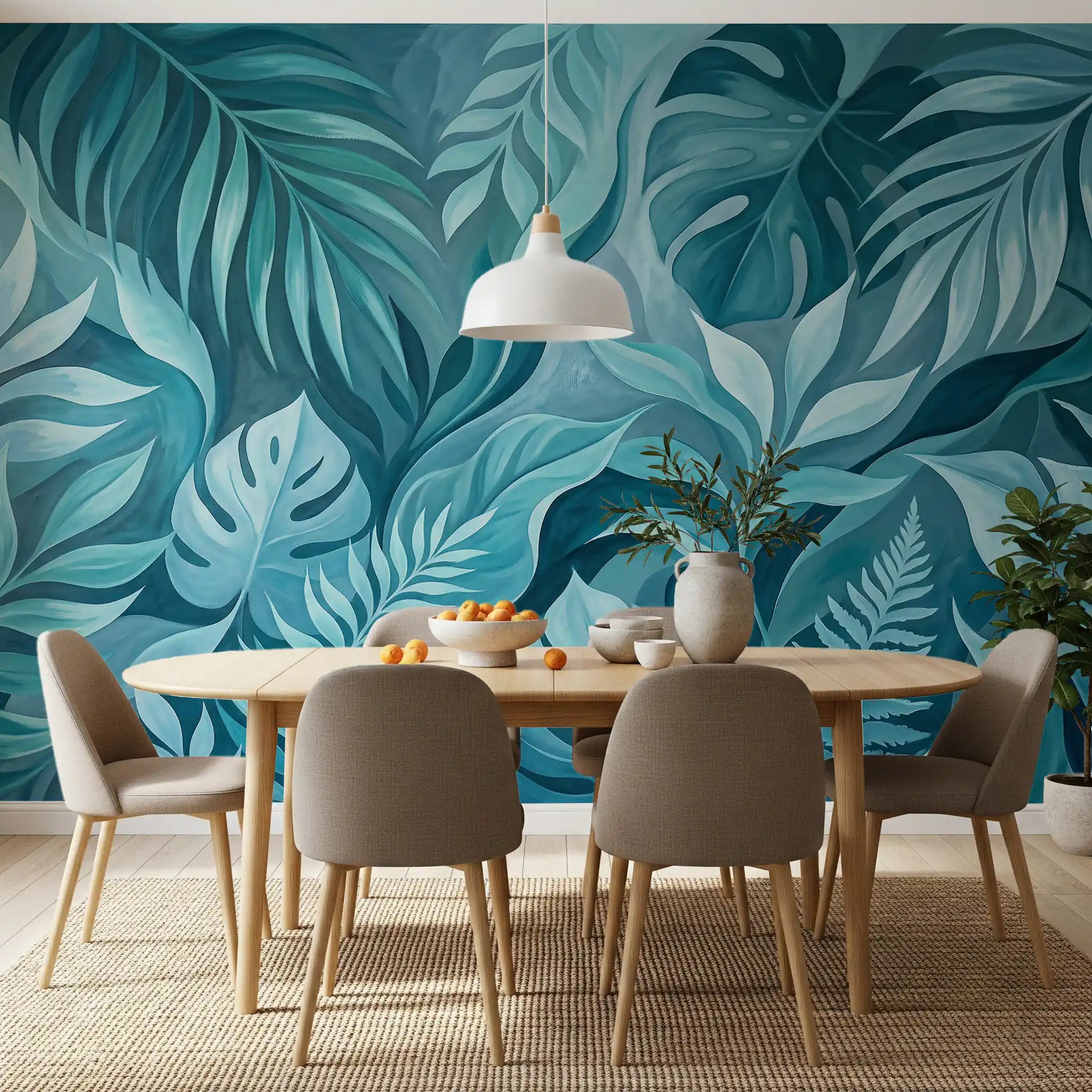 Immerse your space in the serene depths of a tropical forest with this exquisite wallpaper for walls. Lush, painterly leaves intertwine across the design, showcasing a vibrant array of botanical forms including graceful palms, broad monsteras, and delicate ferns. The captivating colour palette features rich teal, calming blue-green, and refreshing aqua tones, creating a tranquil atmosphere. This sophisticated design adds immediate visual interest and natural elegance to any room. It works beautifully in living rooms, bedrooms, or dining areas, transforming your walls into a verdant escape. The artwork’s layered depth and soothing hues complement modern, bohemian, or eclectic interior styles, inviting a sense of peace and natural grandeur into your home.