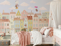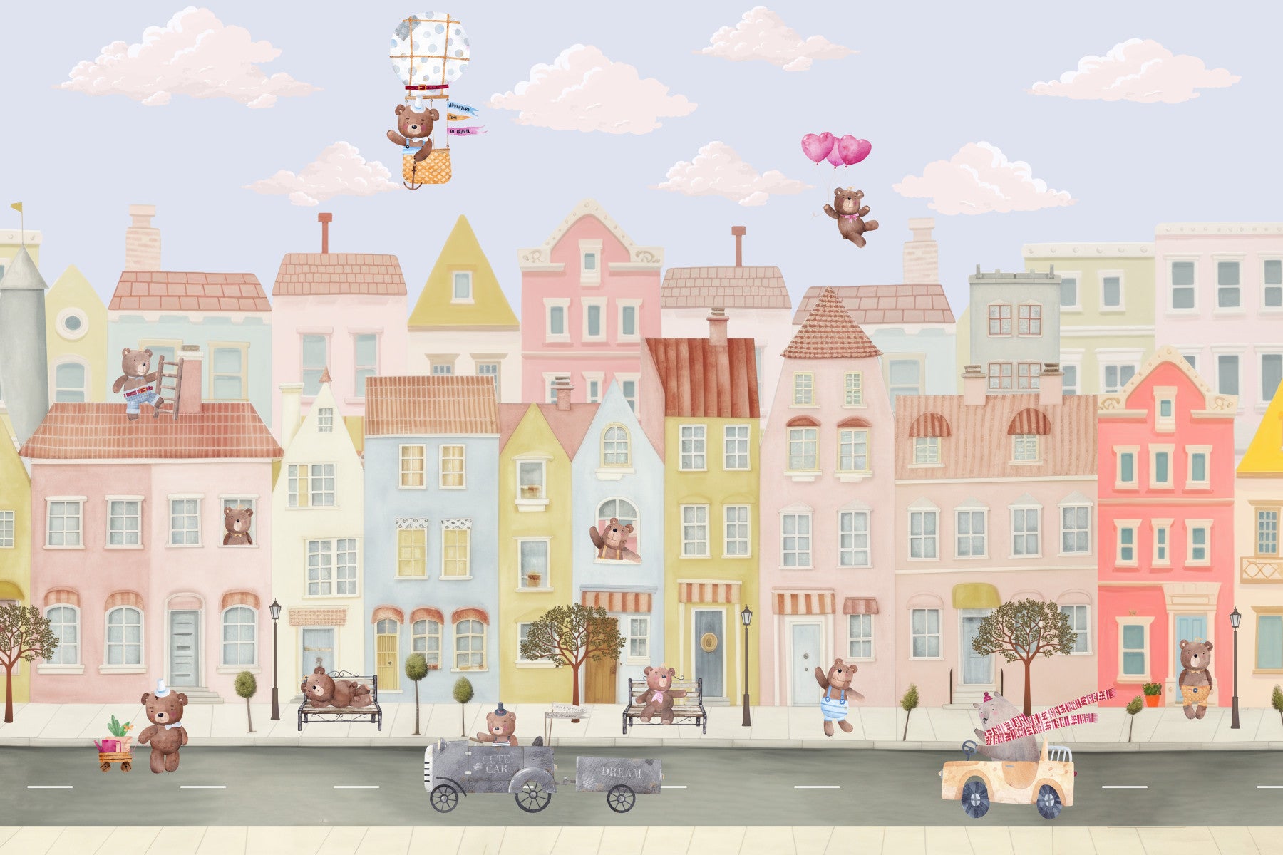 Create a cheerful and imaginative space with this engaging wallpaper for walls. It features a delightful town of pastel buildings occupied by charming teddy bears. Watch the bears enjoy their adventures, from flying high in a hot air balloon to driving in their own miniature cars. This whimsical design is perfect for kids' rooms, playrooms, or nurseries, offering a dreamy escape within your interiors. The soft colours and child-friendly art blend nicely with rooms seeking a happy feel.