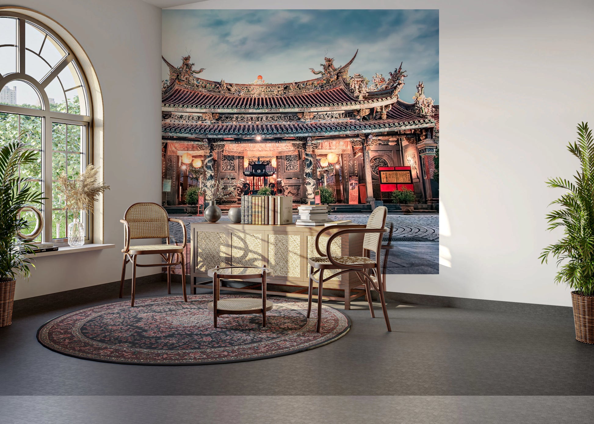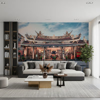 Transform your living space with this stunning wallpaper for walls. It features an intricate design of a traditional temple, complete with ornate carvings and symbolic details. The subdued colour palette creates a calming effect, making it a perfect choice for bedrooms, living rooms, or home offices. This wall covering brings a touch of cultural richness and elegant sophistication, adding character and charm to any room. Its high-quality print ensures that the detailed elements stand out. Elevate your interior decor effortlessly with this detailed architectural scene.