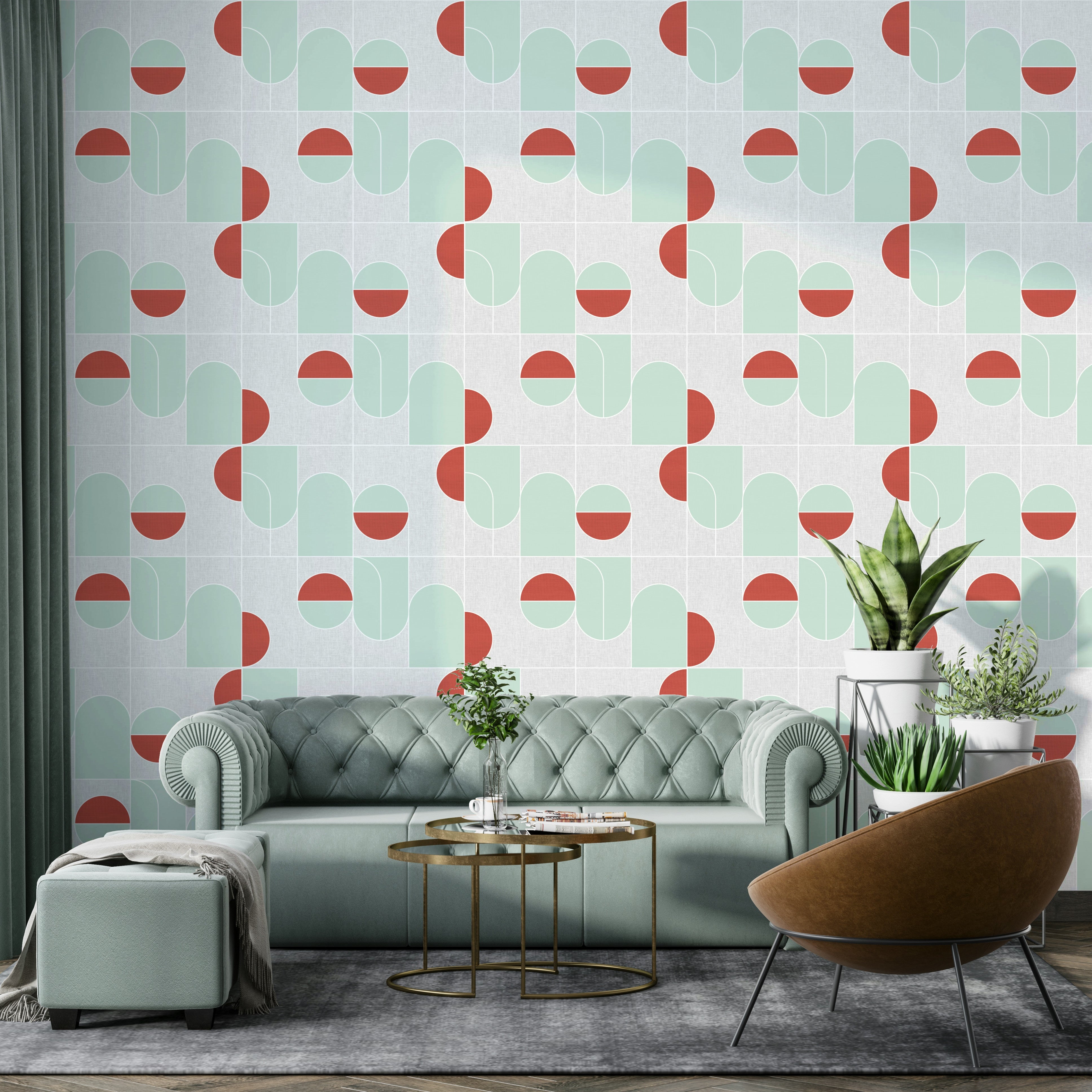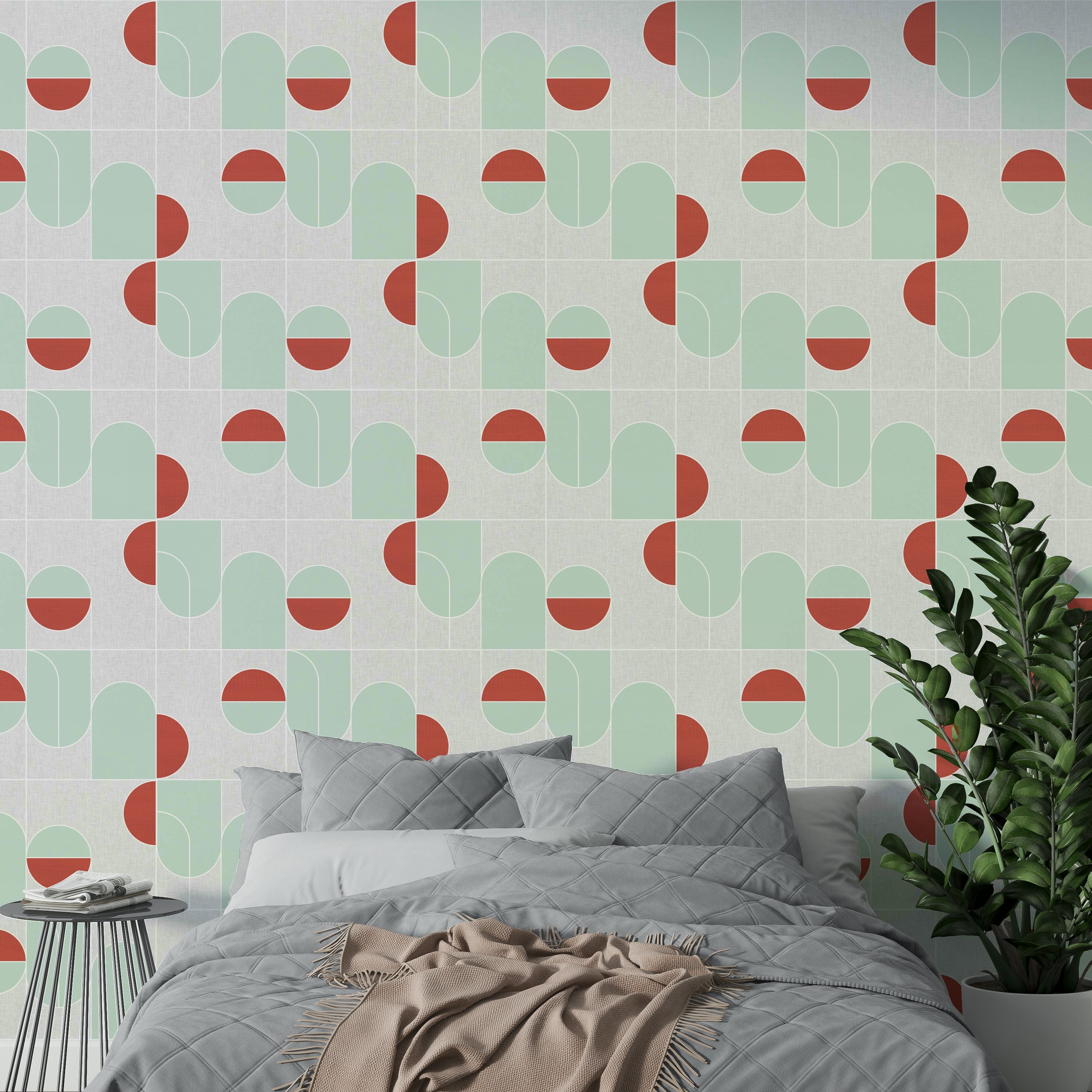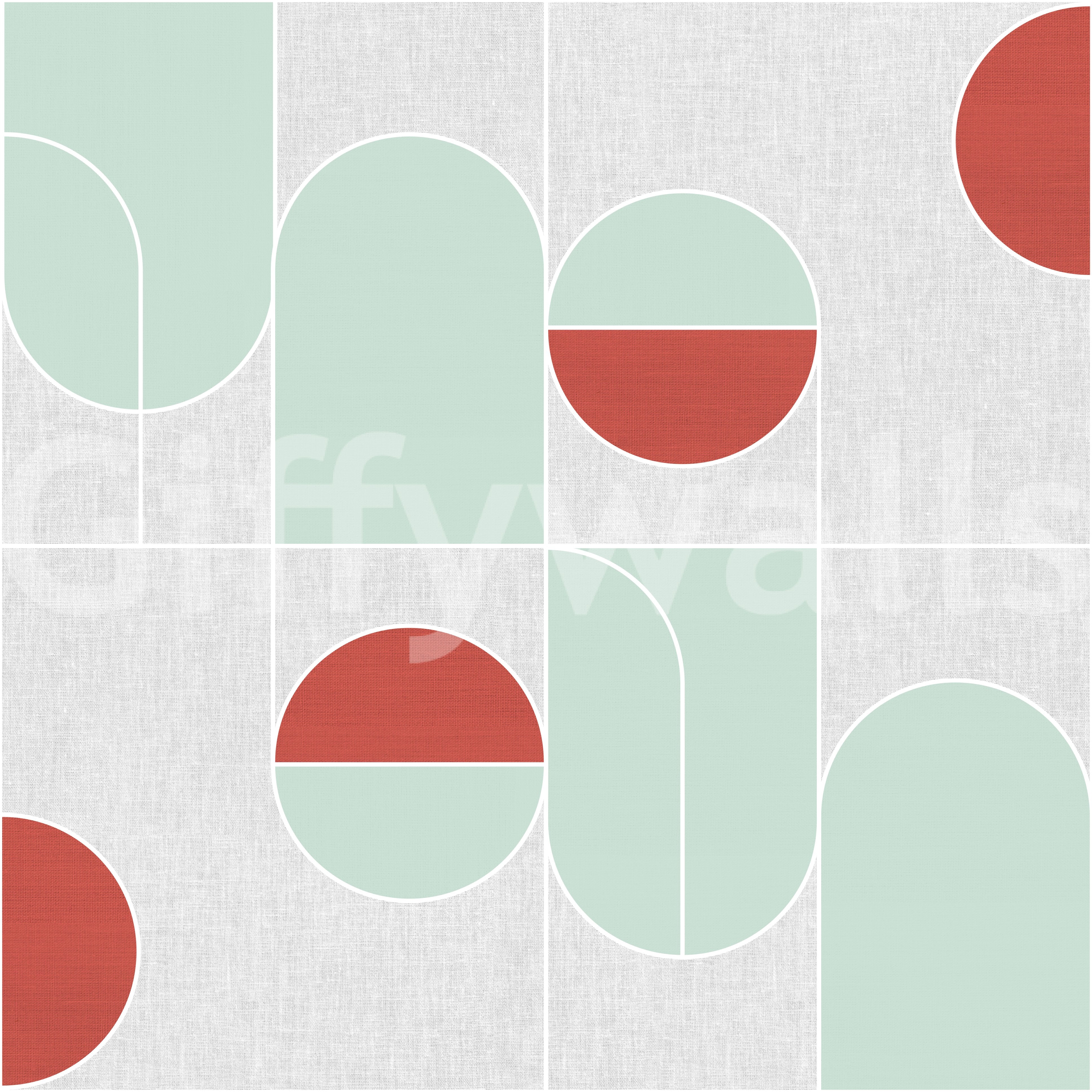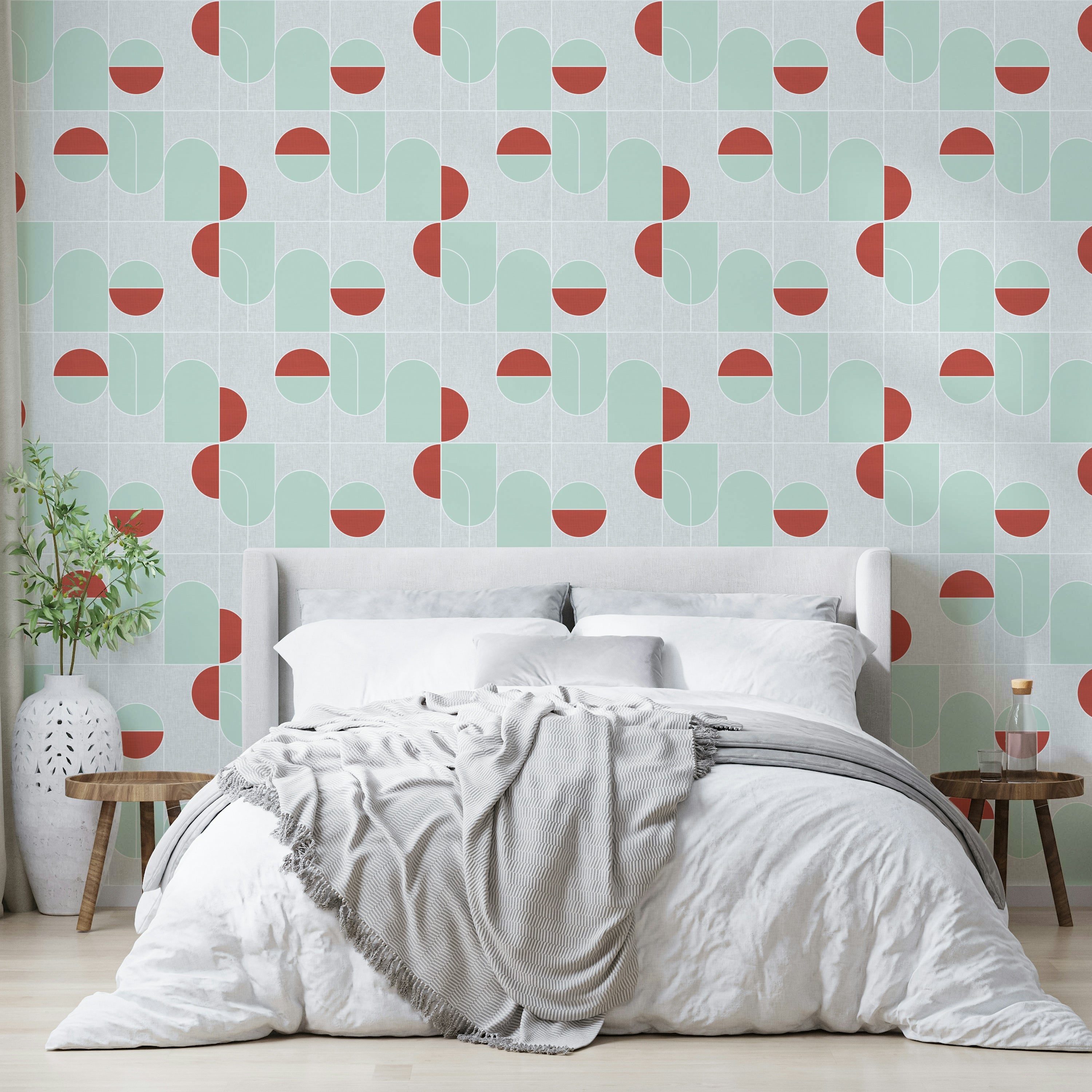 This wallpaper showcases a captivating interplay of geometric shapes in a calming color palette. The combination of soft mint green and rich terracotta creates a visually appealing contrast, while the subtle linen texture adds depth and warmth. The clean lines and balanced composition lend a modern and minimalist feel, perfect for contemporary interiors. This sophisticated design is ideal for creating a serene and stylish atmosphere in any room, from bedrooms and living rooms to hallways and offices. The simple yet elegant pattern provides a versatile backdrop that complements a variety of décor styles.