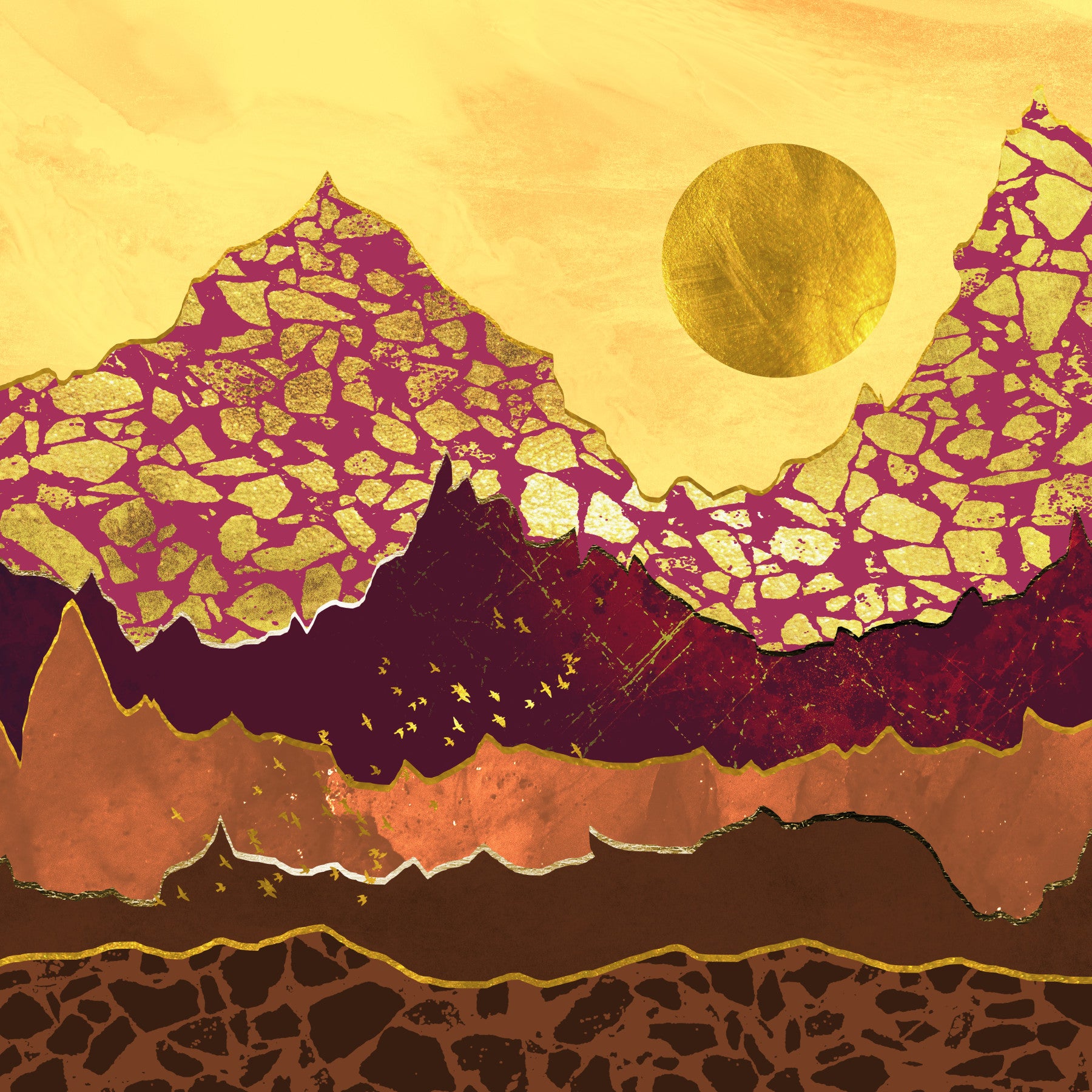 Experience the breathtaking beauty of a terracotta sunset with this captivating wallpaper. Earthy tones of burnt orange, deep crimson, and rich brown create a warm and inviting atmosphere. The gold accents add a touch of opulence and sophistication, while the abstract mountain range evokes a sense of grandeur and tranquility. The subtle texture of the artwork invites the eye to explore its unique details. Perfect for a living room or bedroom, this wallpaper adds a touch of modern elegance and serene beauty to your space. The image is ideal for creating a peaceful and calming ambiance in any room.