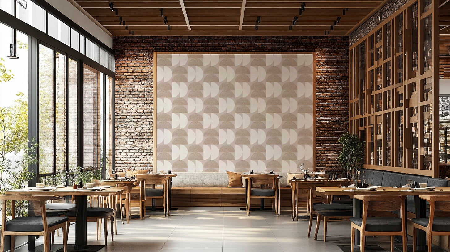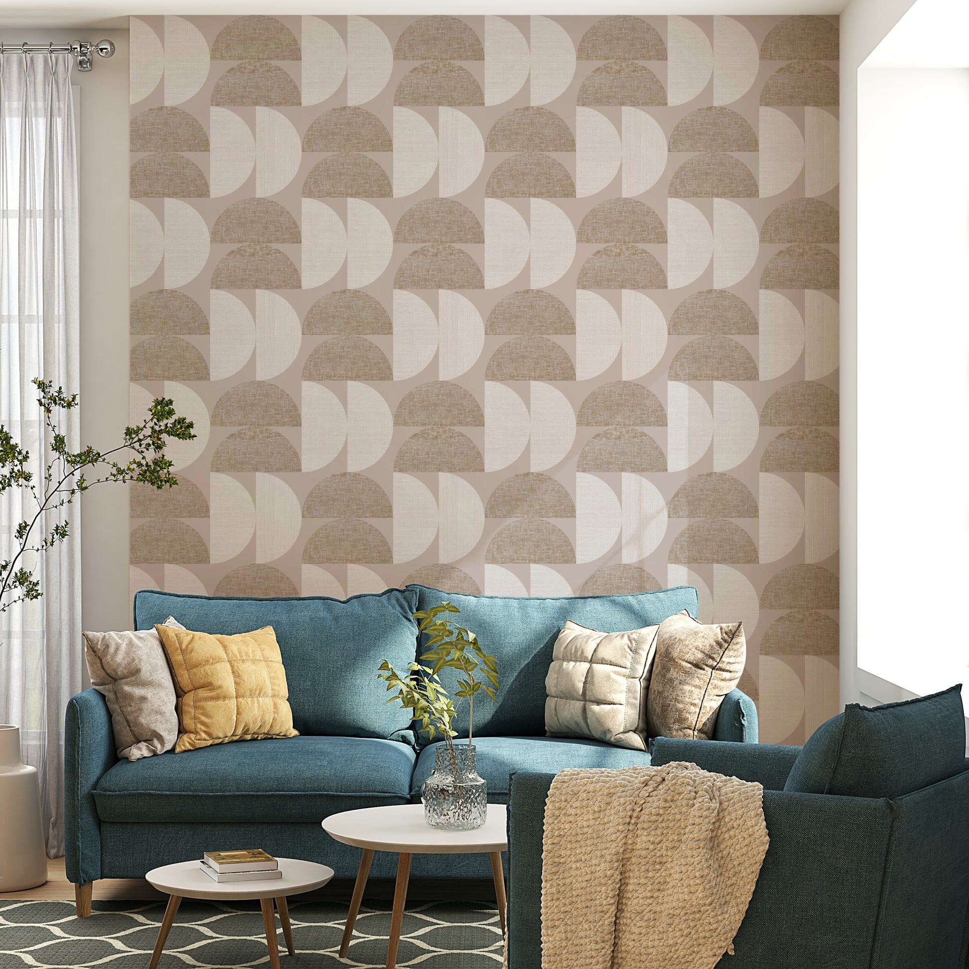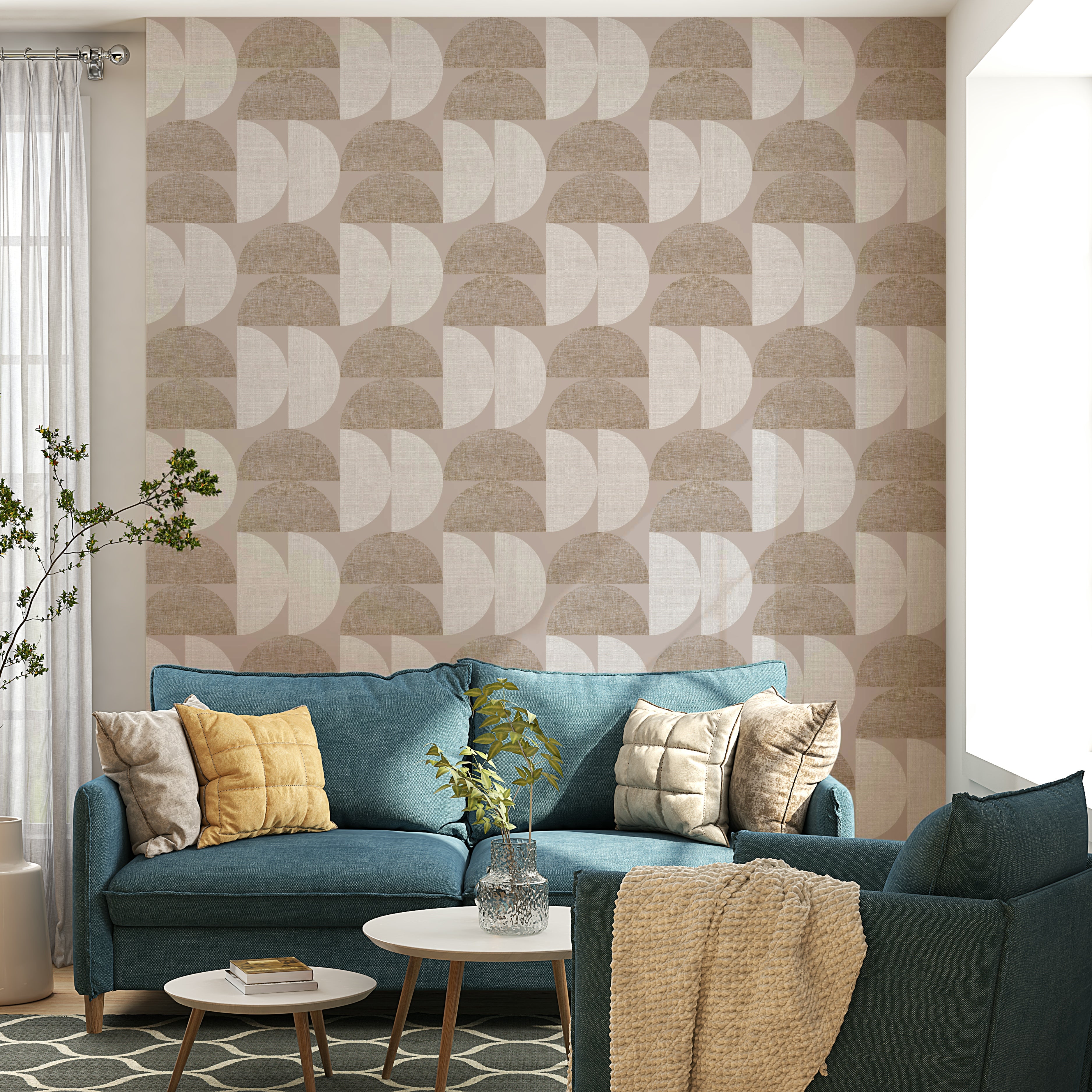 This wallpaper boasts a visually appealing interplay of beige and off-white hues, arranged in a geometric pattern of semicircles. The design evokes the feeling of finely woven linen, adding a layer of subtle texture. The understated color palette creates a soothing and sophisticated ambiance, making it perfect for those who value simplicity and elegance. Whether used in a living room, bedroom, or office, this wallpaper offers a calming retreat from the outside world. Its neutral tones make it a versatile choice, blending seamlessly with various interior styles and décor.