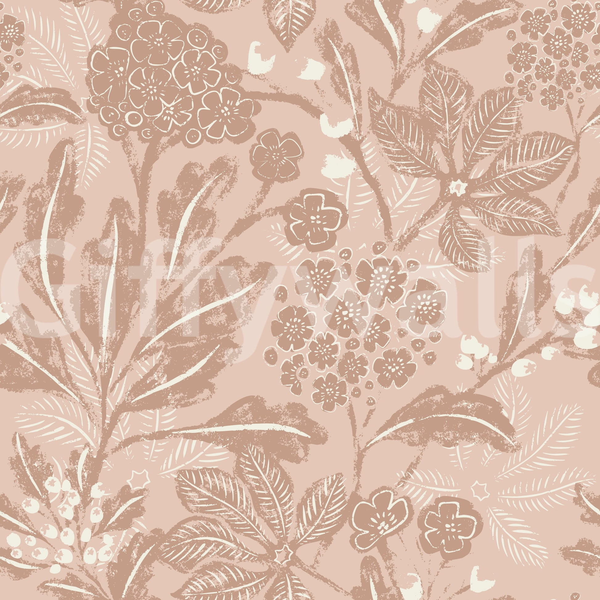 Embrace the earthy elegance of this textured floral wallpaper. The design features a warm terracotta base adorned with intricately detailed cream and brown floral illustrations. The use of textured brushstrokes creates a tactile feel, adding depth and dimension to the design. It offers a sophisticated yet relaxed ambiance, suitable for spaces seeking a comforting and refined aesthetic. Perfect for bedrooms, living rooms, or dining areas where a touch of understated luxury is desired.