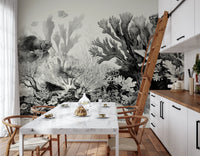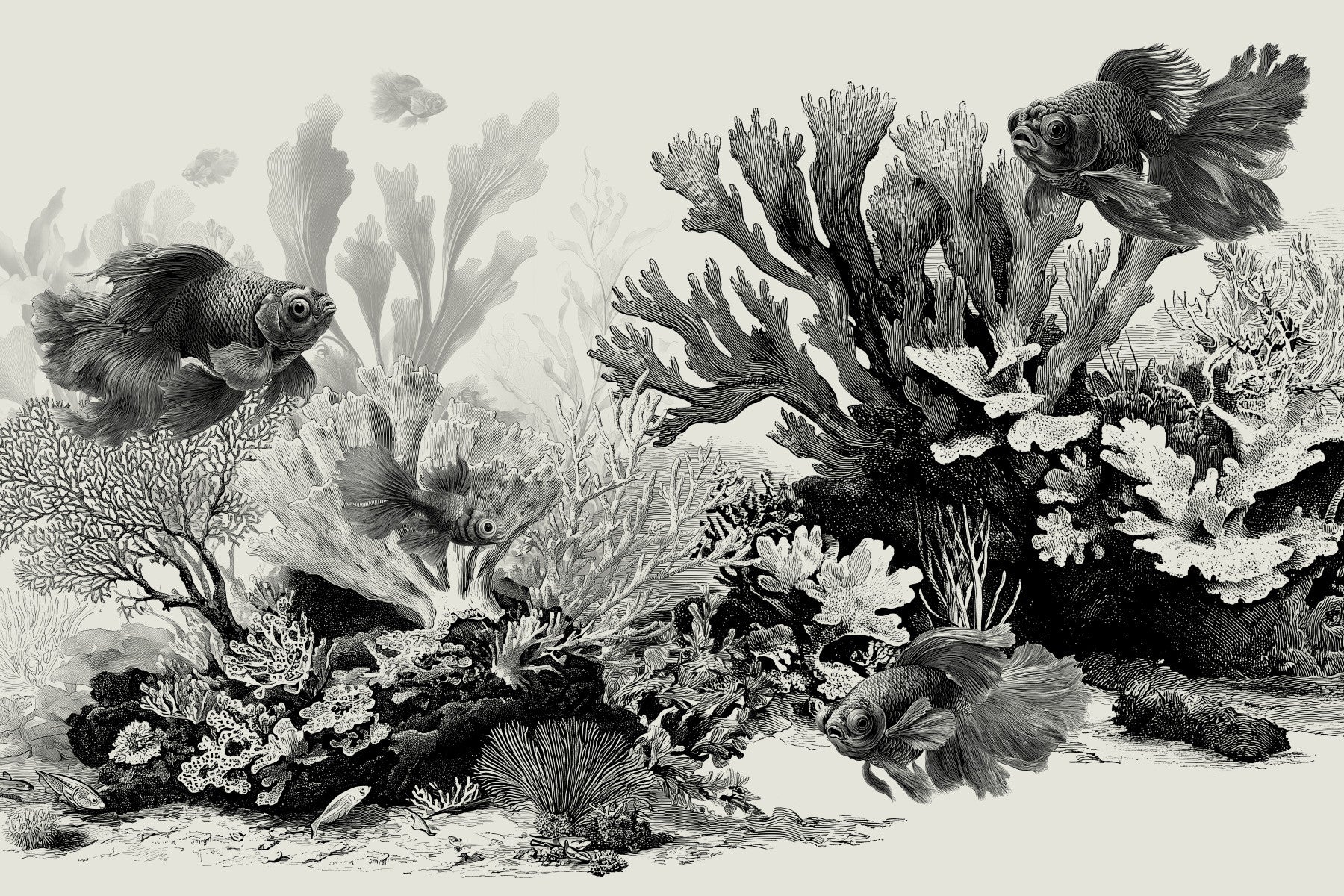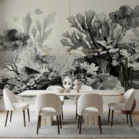 The Aquarium - Black & Cream wallpaper brings a calm, underwater feel to your interior design. Detailed fish glide through a reef of coral, sea fans, and soft plant shapes, all illustrated in a soft warm grey range on a rich cream background. The pattern has a vintage engraving look that feels both classic and modern. Use this wall mural in a bathroom, bedroom, reading nook, or home office for a soothing backdrop, or in a hallway to add gentle visual interest.