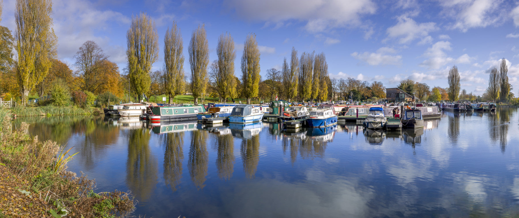 Capture the tranquility of waterside living withThe Boating Marina Wall Mural. This scenic mural showcases a peaceful harbor lined with narrowboats, gently reflected in the still blue waters under a wide, cloud-dappled sky. Framed by golden autumn trees and lush riverbanks, it evokes the calm charm of a countryside marina. Perfect for creating a sense of space and serenity in living rooms, hallways, offices, or lakeside retreats, this mural invites the outdoors in with breathtaking detail. Ideal for those who love nature, boats, or idyllic British scenery.