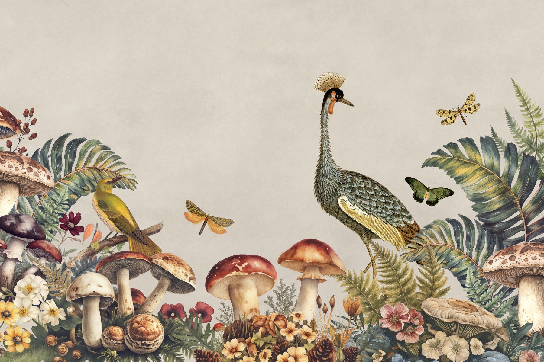 A warm and romantic woodland-inspired design, this vintage botanical mushroom, fern and crane design captures the nostalgic beauty of autumn nature studies. Rich earthy hues and rustic charm bring seasonal cosiness to any interior. Use it for a living room to bring some woodland vibes to your town house or to create a authentic style in your cabin at the lake. Also unique for a country style hotel room or rustic restaurant