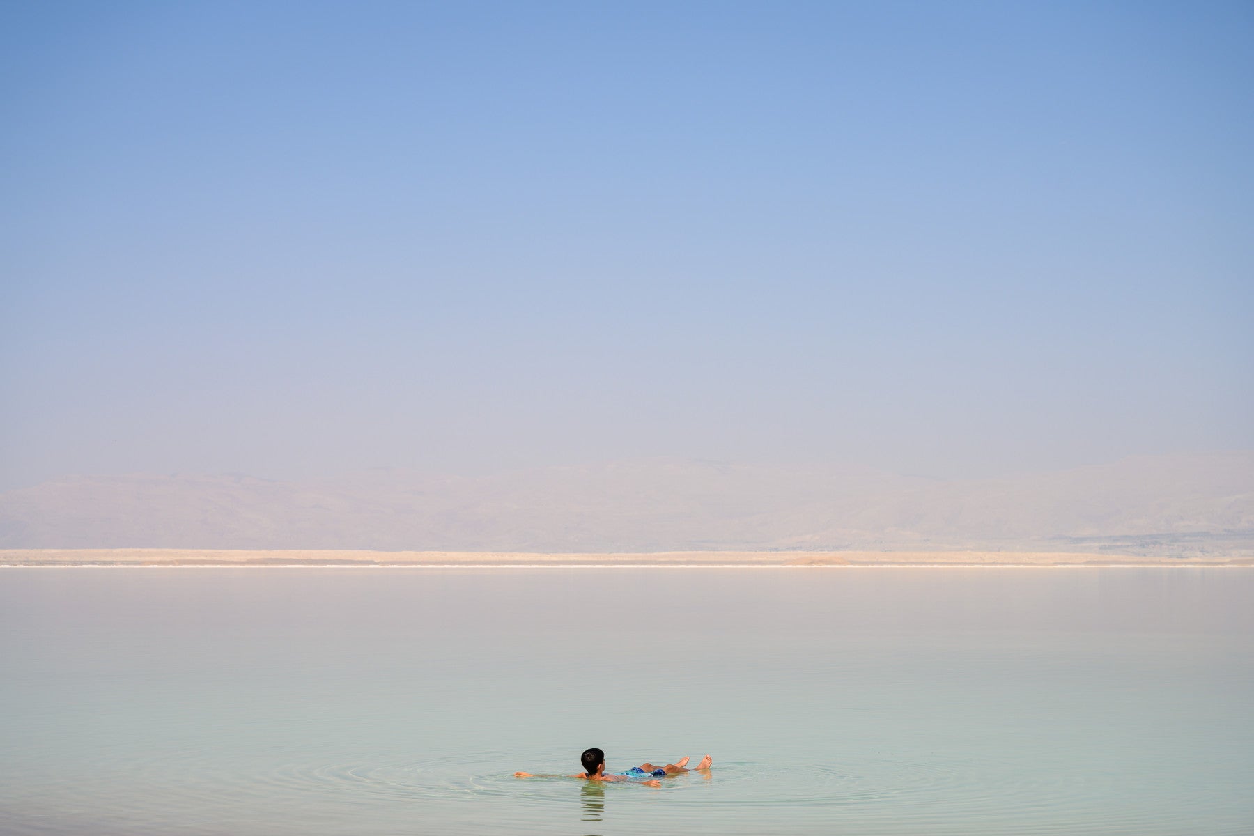 Immerse yourself in the tranquil serenity of 'The Dead Sea #1'. This captivating wallpaper captures the otherworldly beauty of this unique landscape, showcasing a vast expanse of still, mineral-rich water under a hazy, azure sky. A lone figure floats effortlessly, embodying the sea's legendary buoyancy and offering a sense of peace and solitude. The distant, muted tones of the surrounding desert mountains add depth and perspective, creating a minimalist yet evocative composition. 'The Dead Sea #1' brings a sense of calm and wonder to your screen, a reminder of nature's extraordinary power and the possibility of weightless tranquility in our busy lives. Perfect for those seeking a serene and visually striking backdrop.