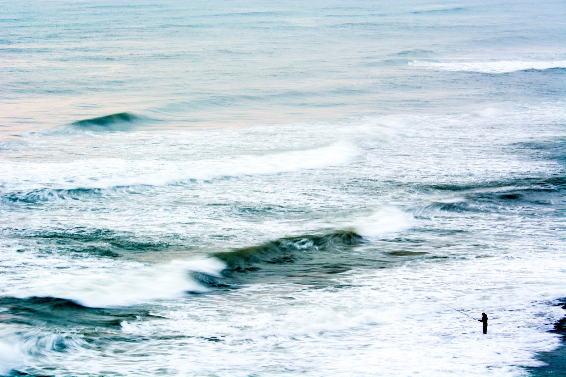 Immerse yourself in the serene yet powerful essence of 'The Fisherman I'. This evocative wallpaper captures a lone fisherman silhouetted against the turbulent embrace of the ocean. Swirling turquoise and white waves create a mesmerizing, almost abstract, representation of the sea's raw energy. The long exposure enhances the motion, turning the water into a fluid dance of light and shadow, a canvas where nature paints its drama. The solitary figure stands as a testament to resilience, a symbol of human connection with the vast, untamed wilderness. 'The Fisherman I' offers a calming yet invigorating visual experience, perfect for adding depth and a touch of contemplative solitude to any digital space. Let the rhythmic pulse of the ocean wash over you each time you glance at your screen.