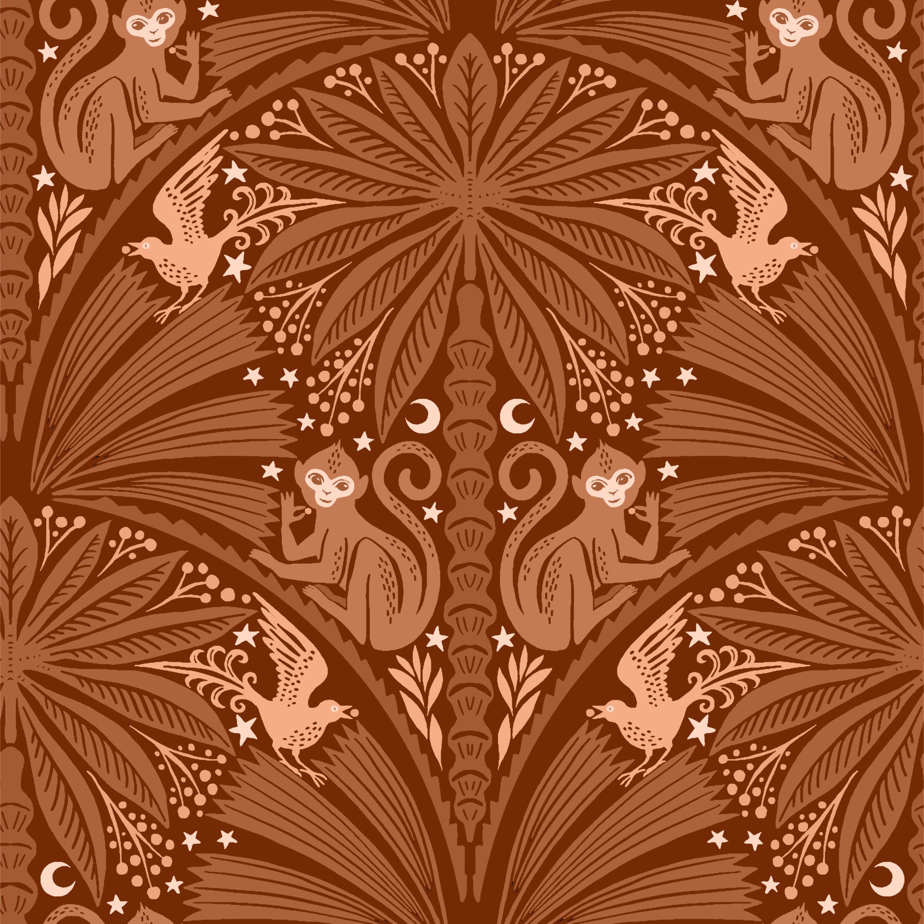Embrace the enchanting world of 'The Jungle Berry Thief: Moon Monkey & Bird'. This wallpaper showcases a captivating art deco-inspired design featuring mischievous moon monkeys amidst lush jungle foliage. Subtle crescent moons and twinkling stars add a mystical touch to the rich, earthy tones. Playful birds flit amongst the branches, seemingly sharing in the monkeys' berry-snatching adventures. The intricate details and symmetrical composition create a sophisticated yet whimsical atmosphere, perfect for adding a touch of jungle magic to any digital device.