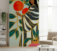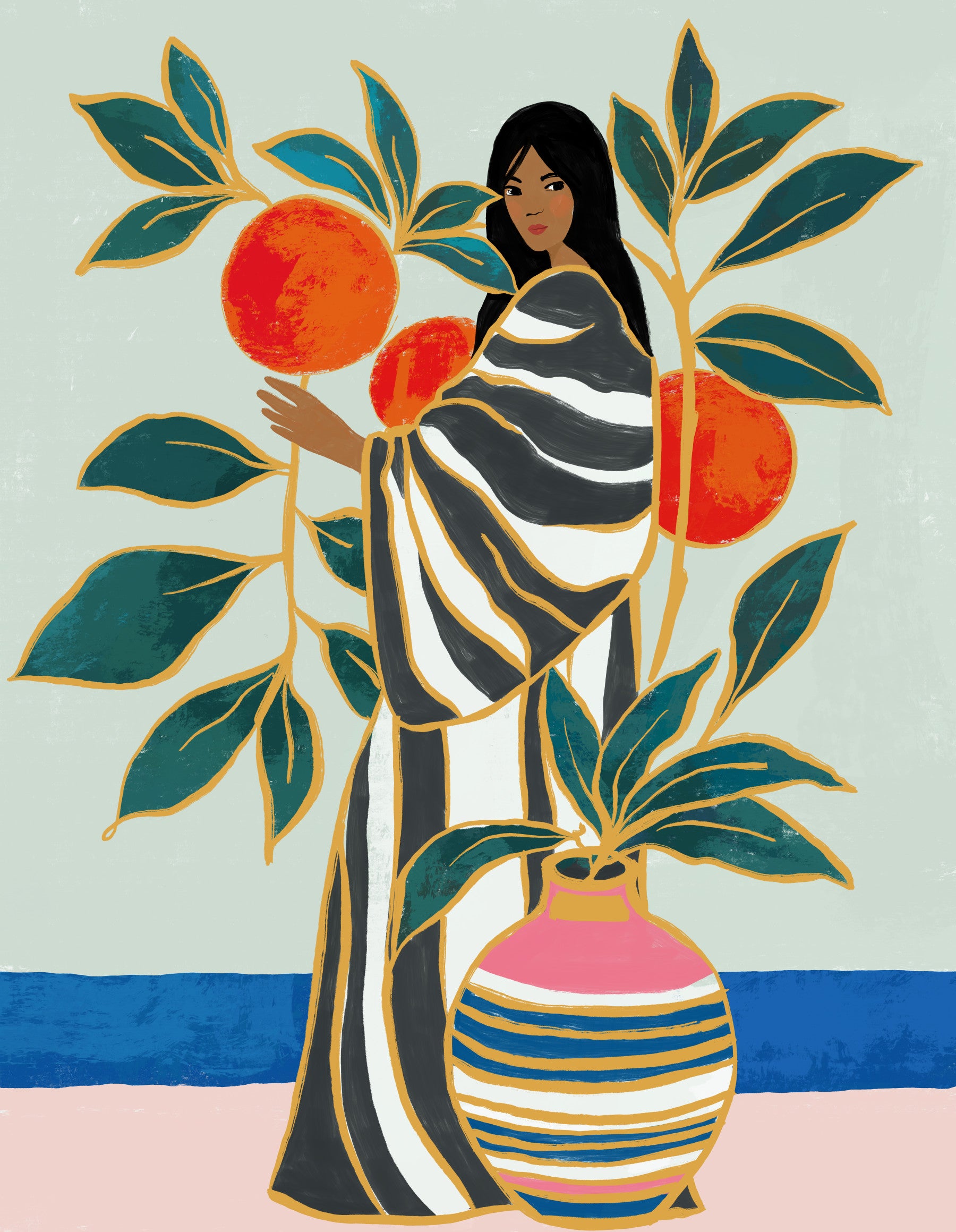 Invite a touch of serene elegance into your space with "The Keeper of Oranges". This captivating piece depicts a graceful figure adorned in a striking striped garment, gently tending to a vibrant orange tree. The bold strokes and warm hues create a sense of tranquility, while the graphic patterns add a modern edge. A stylish vase completes the composition, adding a final flourish to this scene of understated beauty. Envision the way this image will give an inviting and comfortable impression. Ideal for adding a sophisticated and colourful accent to any room, "The Keeper of Oranges" is more than just art – it's a statement. The perfect piece to transform your wall into a gallery. Bring the beauty and bounty of nature indoors with this stunning visual celebration, making your home a welcoming haven.