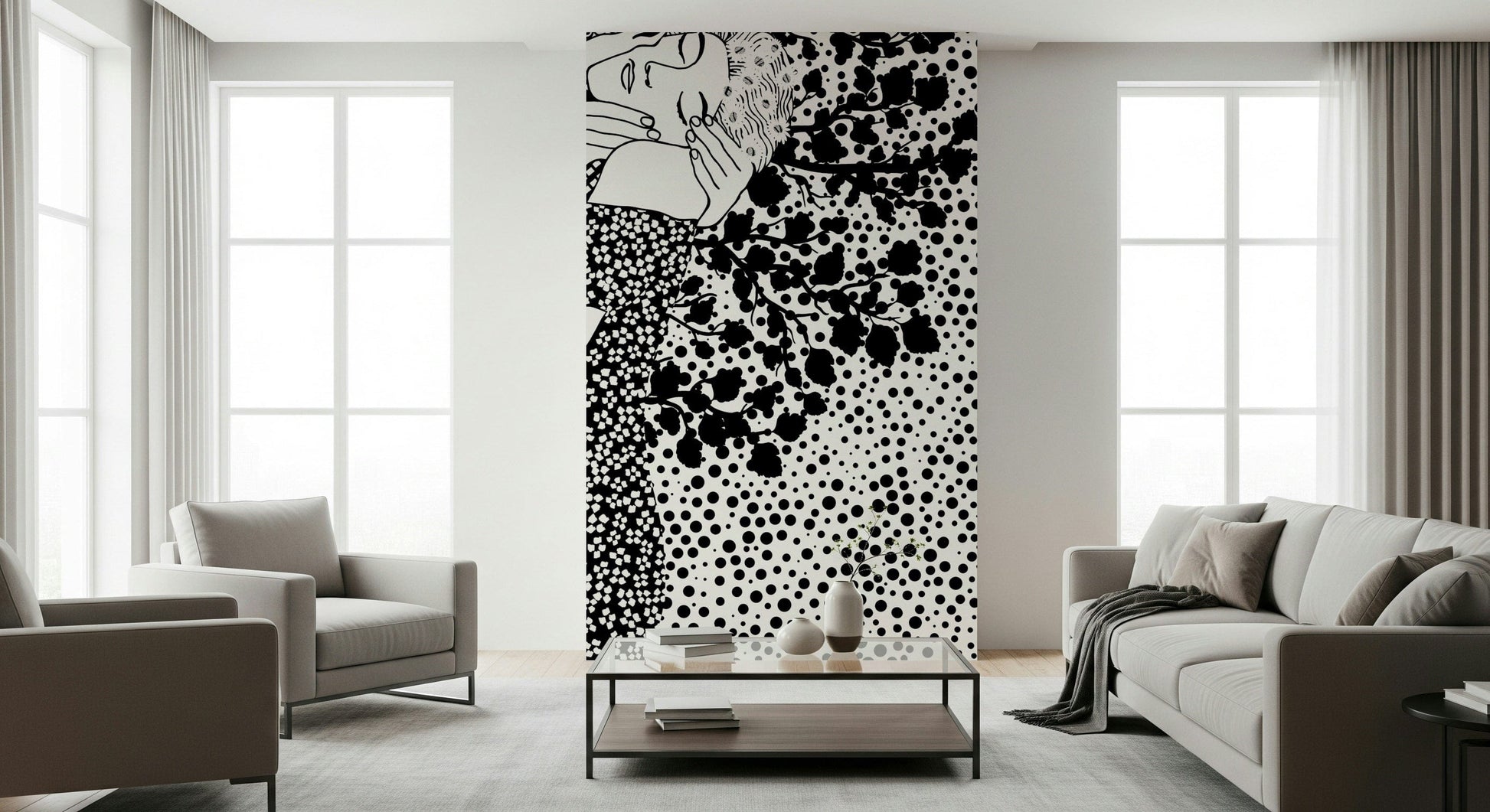 Embrace the power of affection with "The Kiss II", a striking monochrome design that brings a touch of artistry to your living space. This intimate wall décor depicts a couple locked in a tender embrace, rendered in exquisite detail. A canopy of stylized leaves and a swirling backdrop create a dreamlike atmosphere, evoking feelings of serenity and passion. The black and white palette lends a timeless and sophisticated aesthetic, suitable for various interior styles. Notice the intricate patterns adorning their clothing, adding a layer of texture and visual interest to the piece. Transform any room into a haven of love and tranquility with this captivating work of art, infusing your walls with an undeniable sense of romance and modern flair. It is more than just decoration; it is a statement about the beauty and depth of human connection, forever captured in a stunning visual masterpiece.