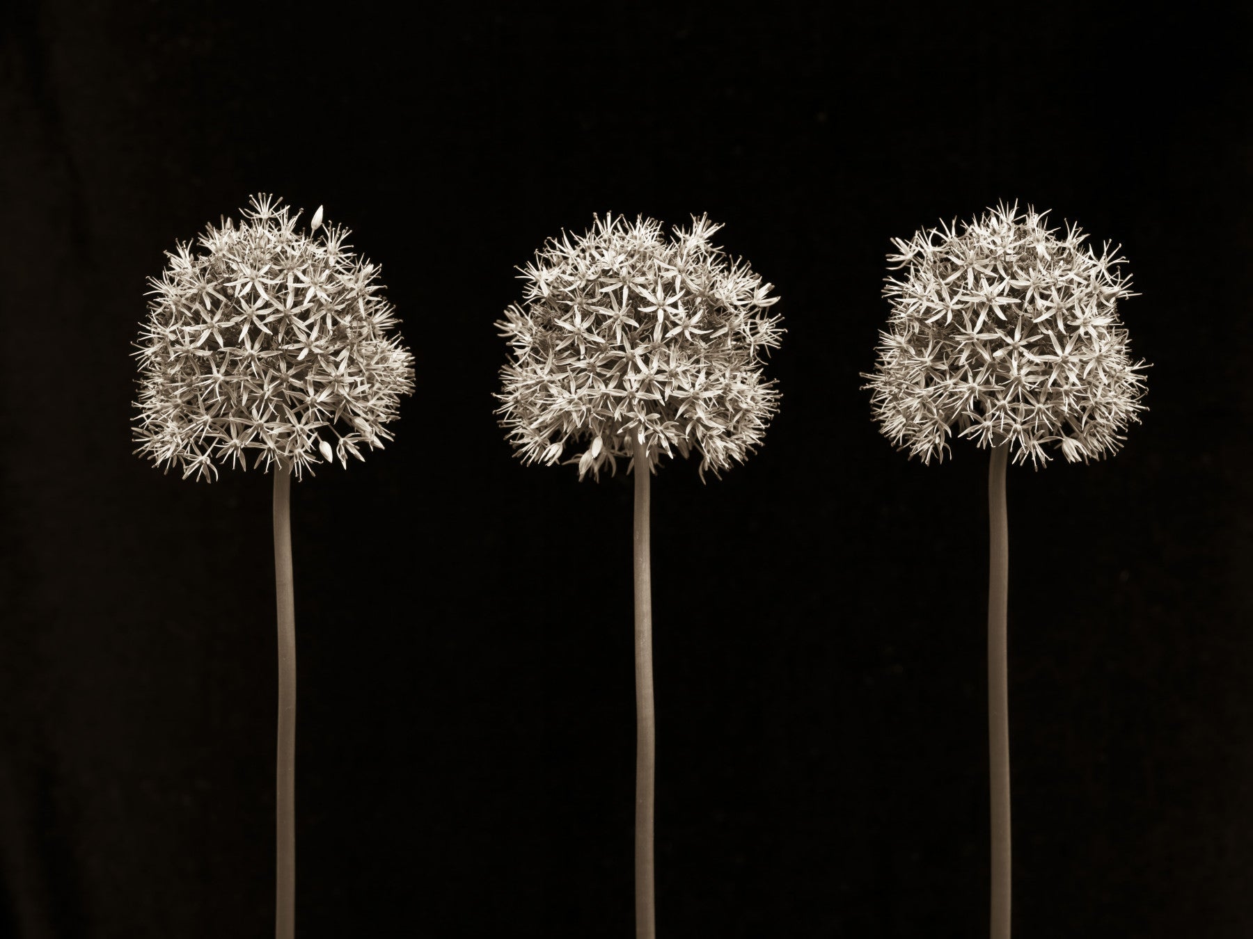 Three delicate allium flowers wallpaper mural with contrasting black background.