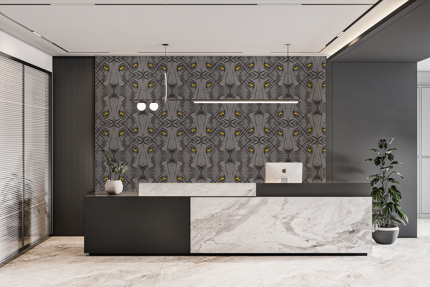 Tiger Gaze Hypnotic Wallpaper mesmerizes with a tapestry of feline eyes that command attention, turning any wall into a captivating display. The dominant grey palette is punctuated with pops of yellow, drawing you into the depths of the jungle's mysterious beauty. Ideal for a striking feature wall, this design exudes a powerful presence. Perfect for those who wish to infuse their living space with the allure and enigmatic charm of the wild, this black wallpaper creates an immersive experience that defies the ordinary.