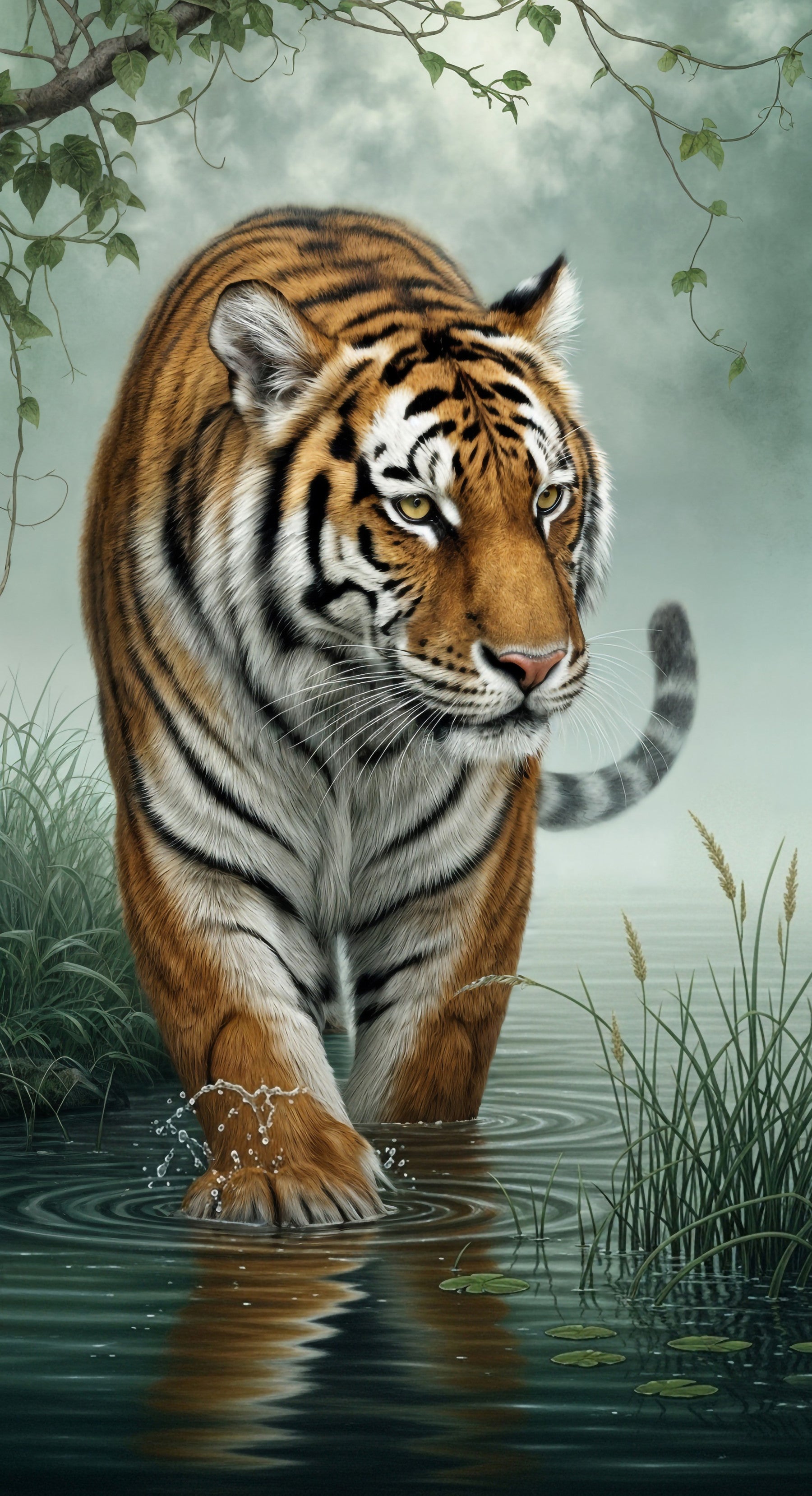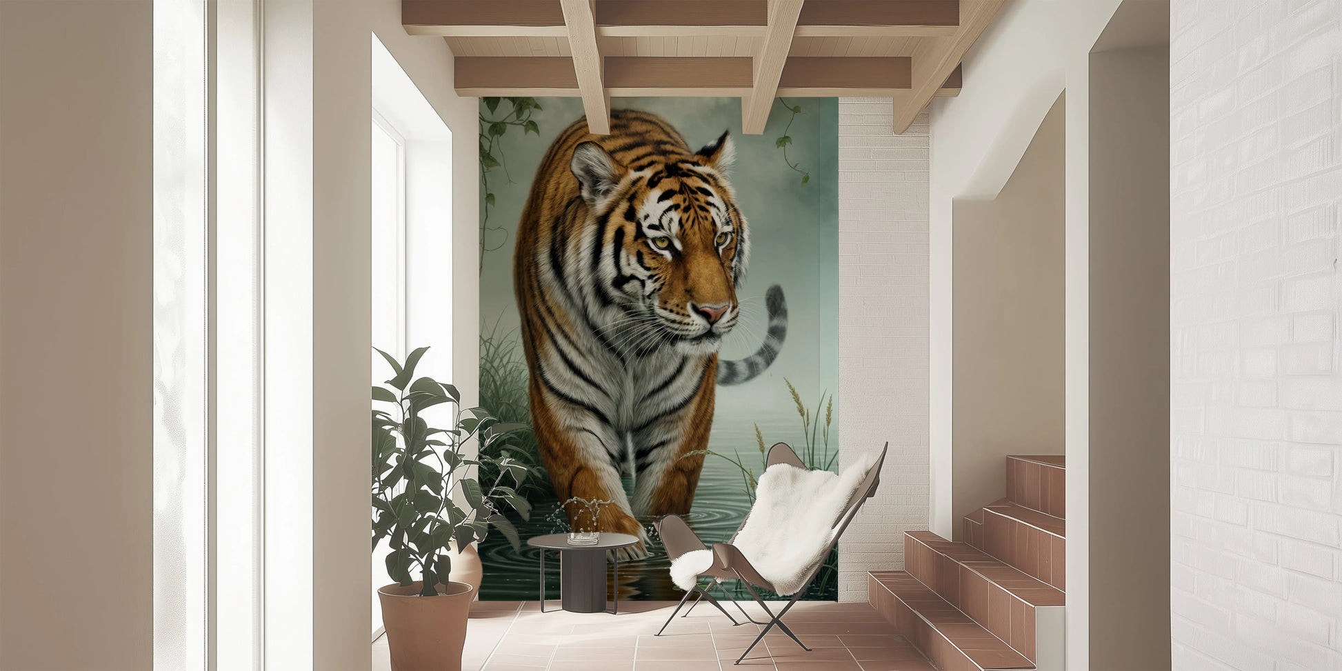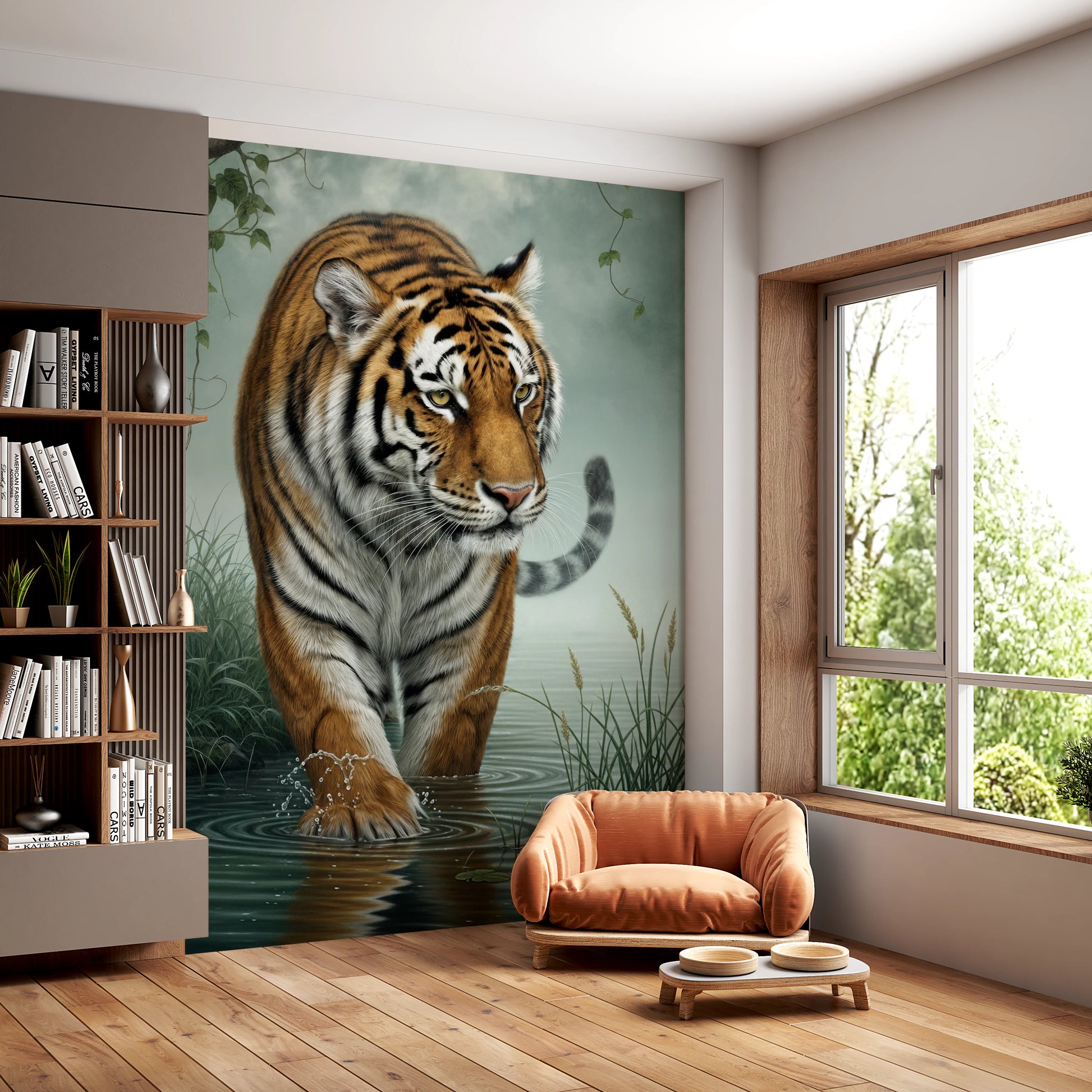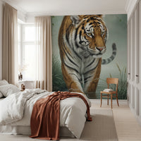 Enhance your living space with this captivating wallpaper for walls featuring a majestic tiger wading through water. The artwork showcases the tiger in rich orange and black stripes, contrasting beautifully with the soft green of the surrounding foliage and tranquil water. The colour palette creates a serene and immersive environment, perfect for a living room, bedroom, or even a hallway. This design brings the power and grace of wildlife into your home, creating a bold yet peaceful statement. This wallpaper complements spaces seeking a touch of nature’s beauty. The exquisite detail offers a timeless appeal.