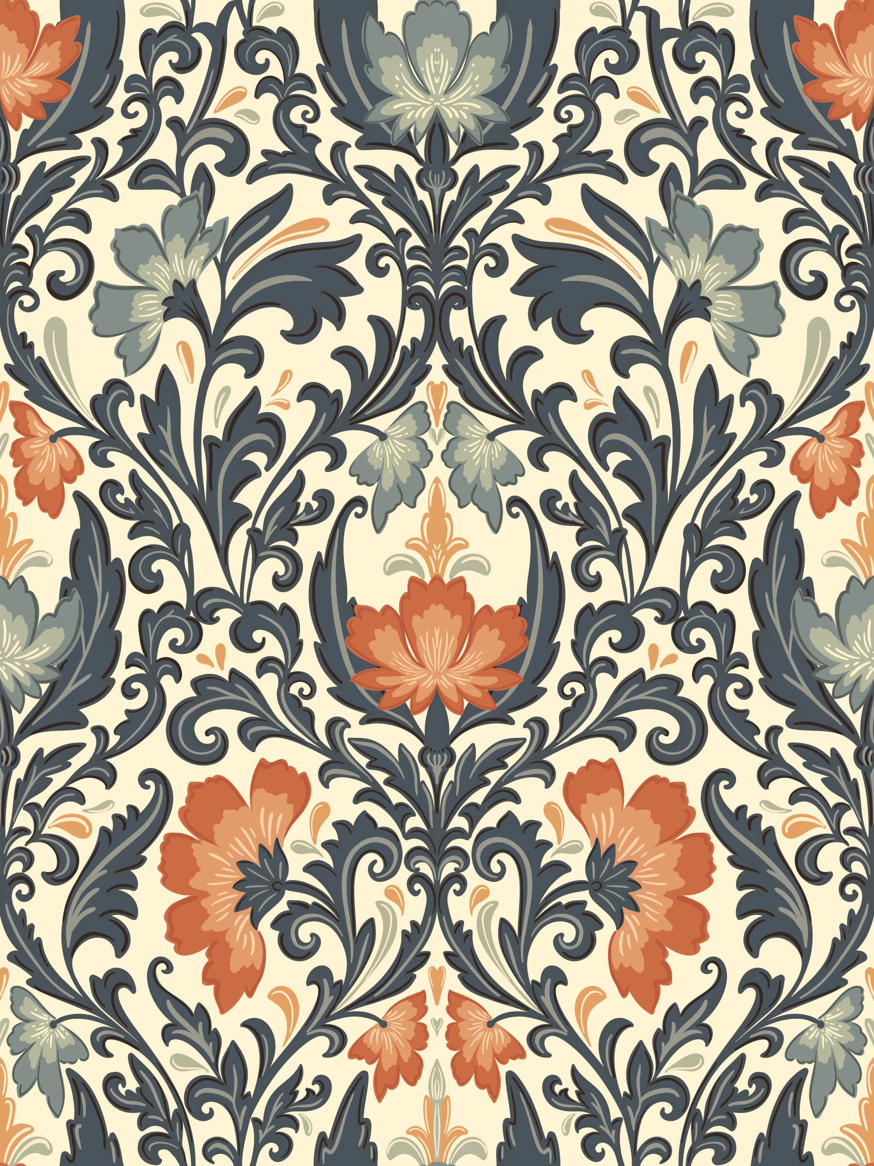 Elevate interiors with this stylized floral wallpaper. This wallpaper for walls displays a symphony of terracotta, navy, and gray-blue tones. This wallpaper creates a striking focal point. Its intricate design and rich colors enhance the look of any room. It delivers warmth and sophistication. Ideal for a living room, dining room, or bedroom, it complements various design aesthetics. Discover the elegant charm it brings to your home.