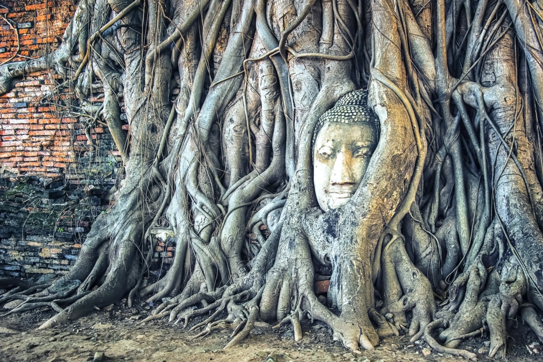 Embrace ancient wisdom with this wallpaper. The Buddha's serene face, embraced by the strength of tree roots, evokes a sense of peace and balance. A weathered brick wall provides an aged atmosphere. This unique wallpaper for walls transforms any room into a space for reflection and calm, making it ideal for meditation rooms or bedrooms. The neutral palette works with many interior designs, creating a focal point that grounds your interiors. Imagine this in your study for an antique touch.