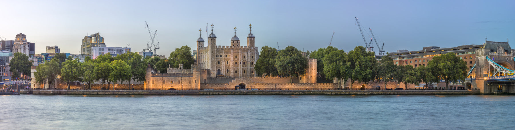 Tower of London by Thames river. Bring a slice of British history into your home with this panoramic view of the Tower of London. Situated along the River Thames, the fortress stands tall amid the surrounding cityscape. The gentle light of dawn highlights the intricate details of the architecture. This majestic image can transform any space. Use it as wallpaper for walls in studies, bedrooms, or dining areas to create an atmosphere of sophistication. Its panoramic format complements the interior architecture.