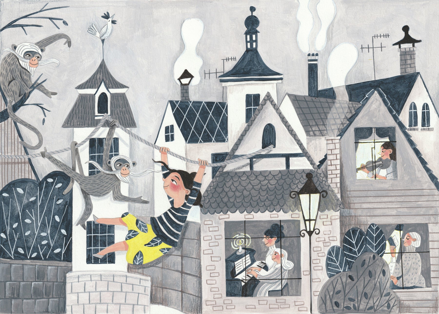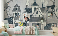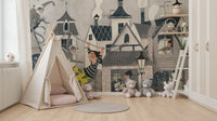 Bring a playful, creative spirit to your walls with this whimsical wallpaper for walls. Grey and yellow hues craft a scene where adventure meets quiet town life. Featuring swinging children and monkeys amongst whimsical houses, this design fosters joy and storytelling. Use it in a kids room, playroom, or nursery. Its unique design provides a fun, imaginative element, helping to create cosy and unique interiors.
