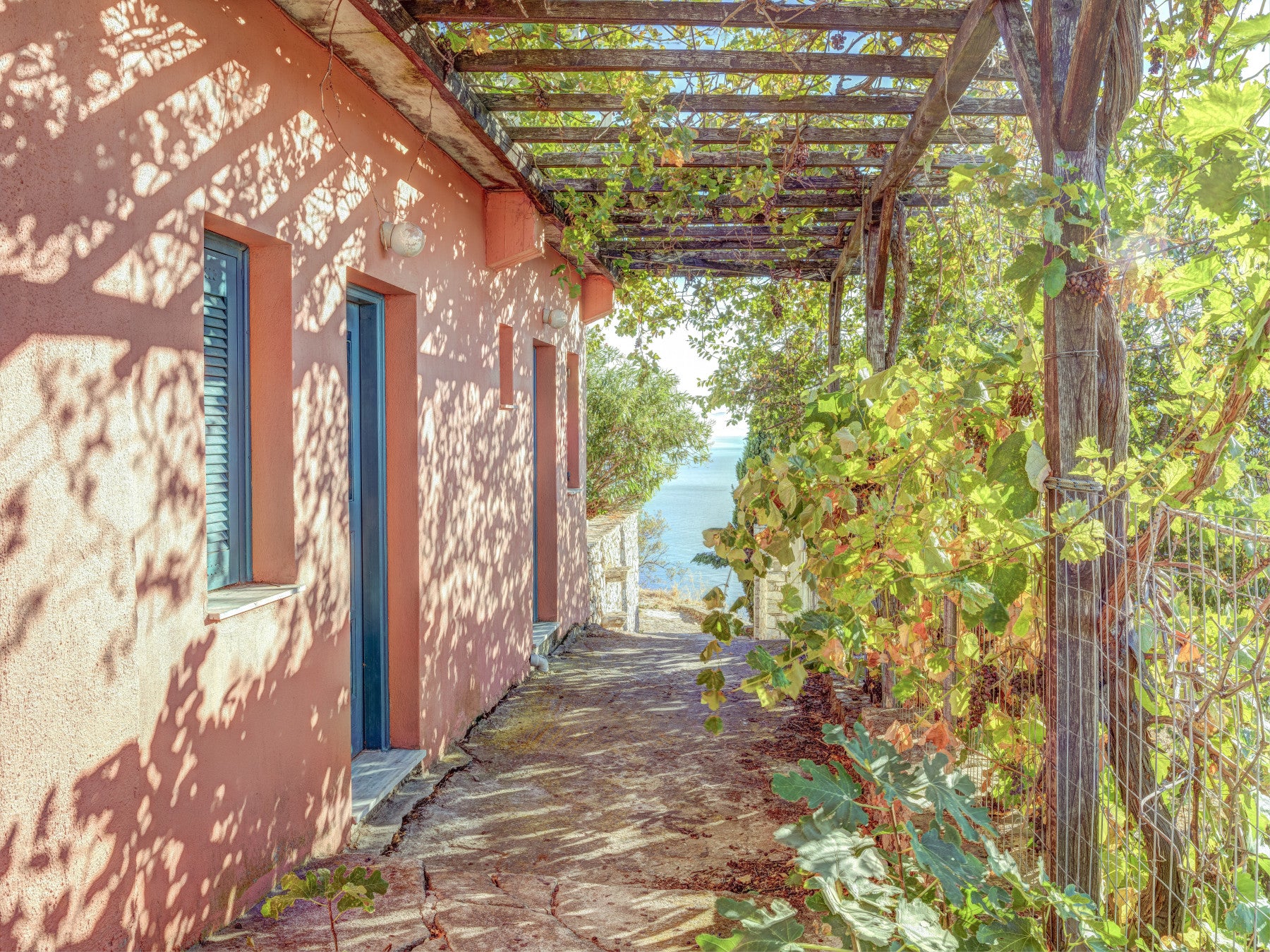Traditional House in Alonissos scene with vines, shadow, and ocean.