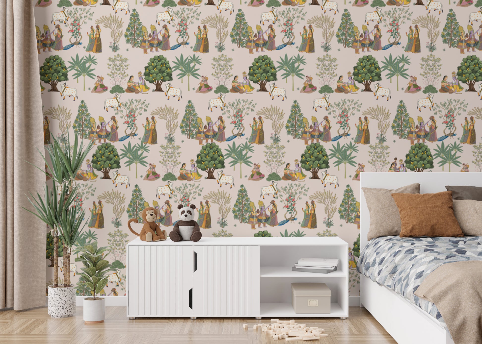 Traditional Indian cultural wall murals captures the essence of Indian folk art wallpaper with detailed patterns and heritage-rich scenes. The design showcases Mughal Heritage Wall Mural elements, featuring elegant figures, nature, and traditional celebrations. Vintage Indian Pattern Wallpaper adds charm with intricate depictions of Indian culture, including lush landscapes and symbolic motifs. Ethnic decorative wall mural elements enhance the storytelling, creating a striking composition. The beige background complements the vivid details, making the mural a timeless addition. Cultural Heritage Wallpaper reflects historical craftsmanship, bringing history and tradition together in a refined and sophisticated manner.