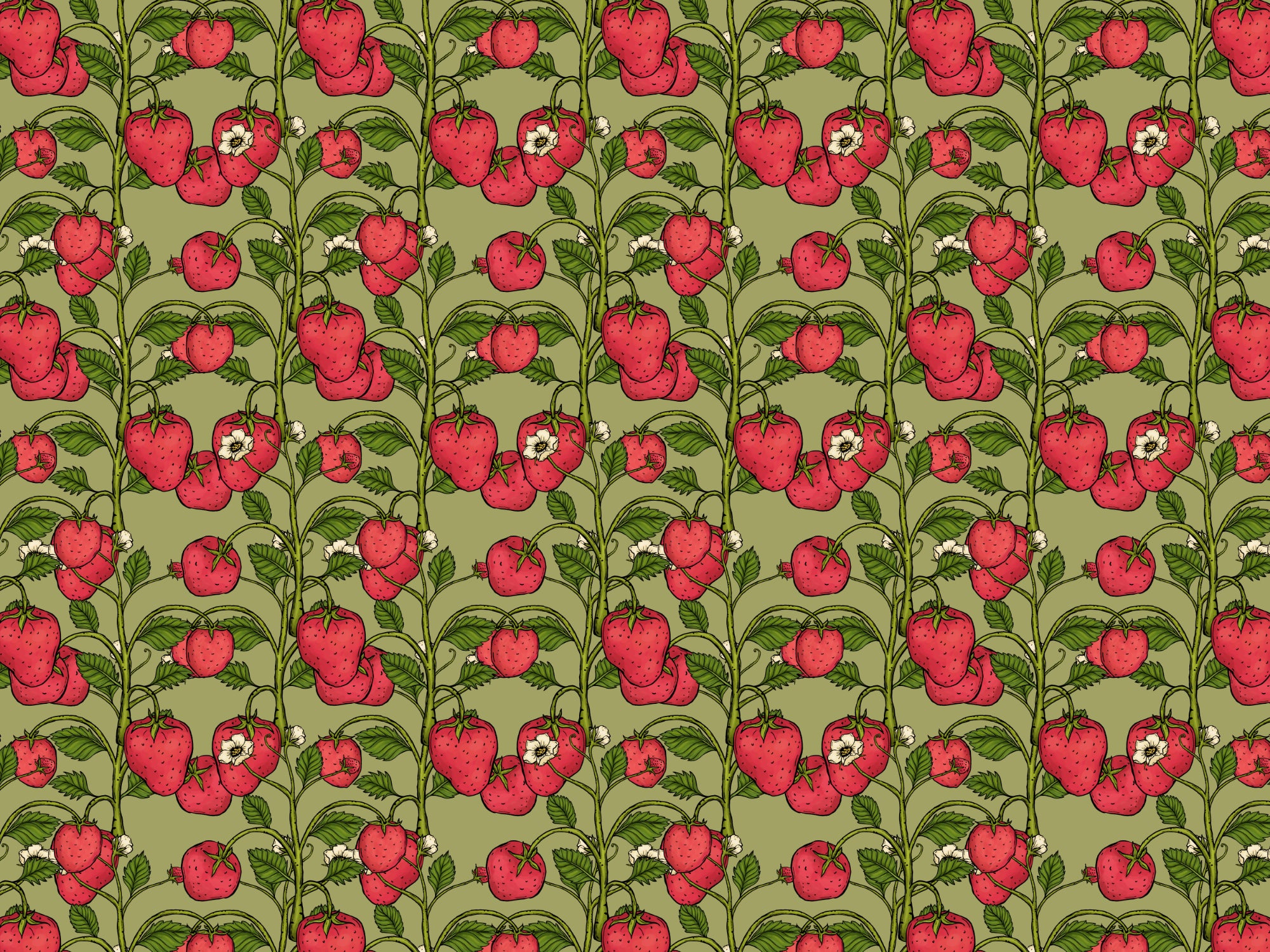 Soft pink trailing strawberries with lush green wallpaper accents.