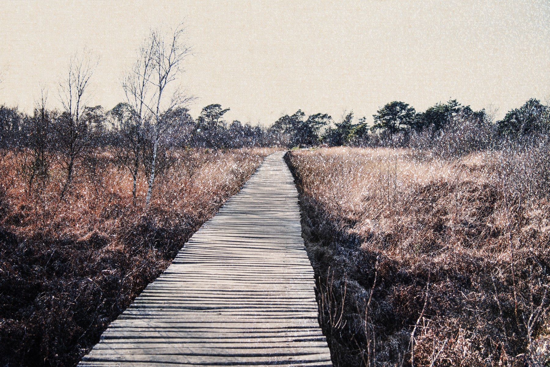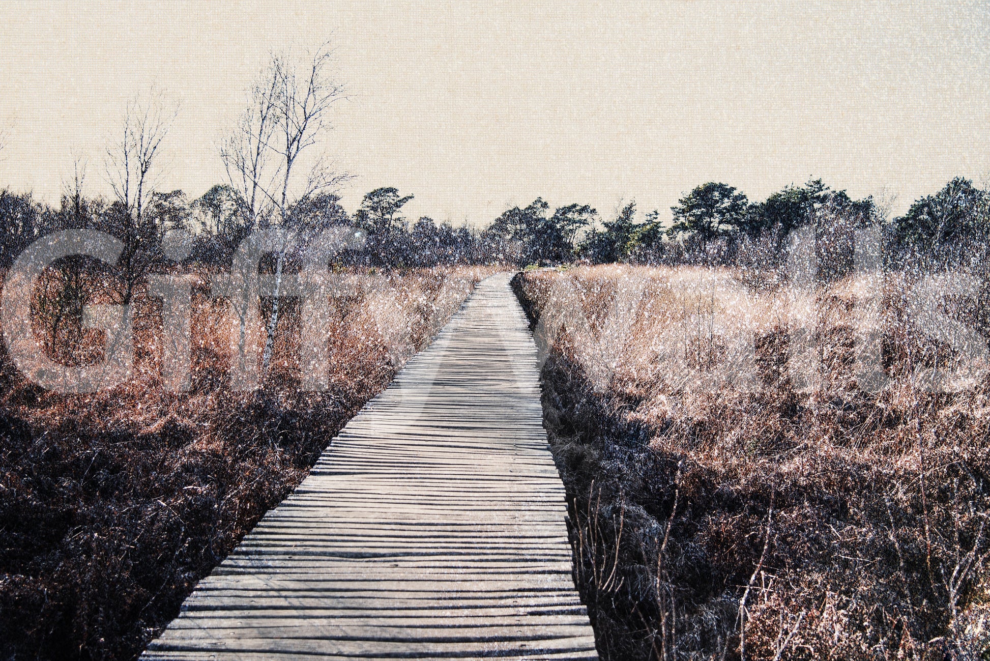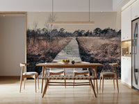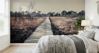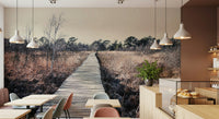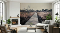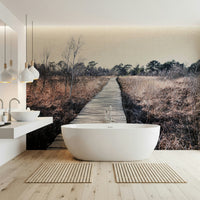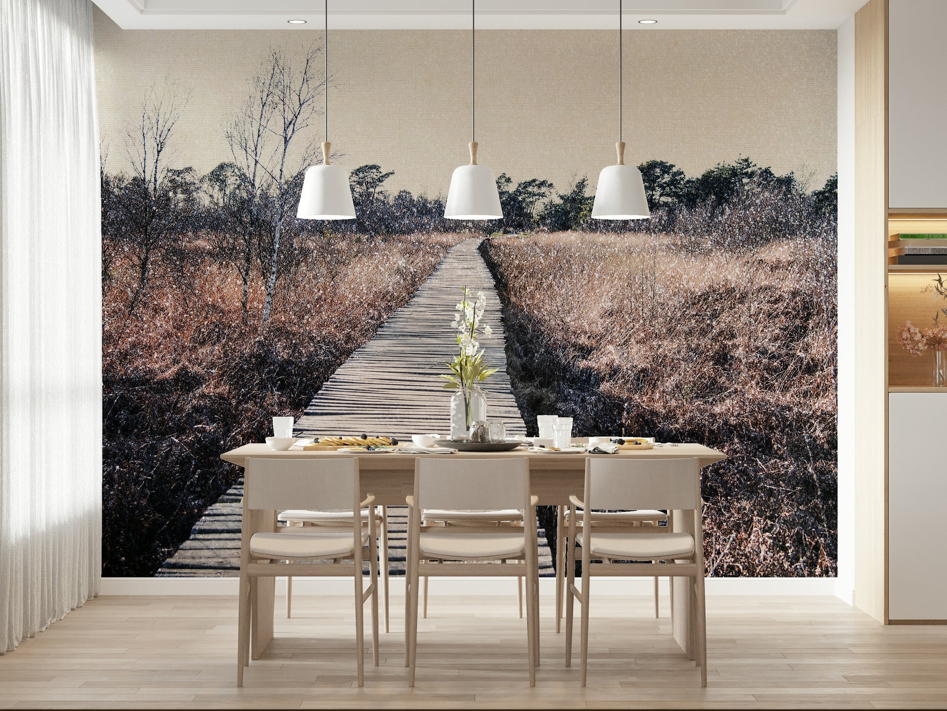 Bring the outdoors inside with this tranquil landscape. The wooden path draws the eye through muted browns and natural tones, creating a sense of calm. Imagine this serene scene as wallpaper for walls in a study or bedroom. The design complements minimalist interiors, adding texture and depth while maintaining a relaxing atmosphere. Consider this for a cosy reading nook, an office, or any space where peace and quiet are valued. The subtle palette invites you to unwind and reconnect with the stillness of nature.
